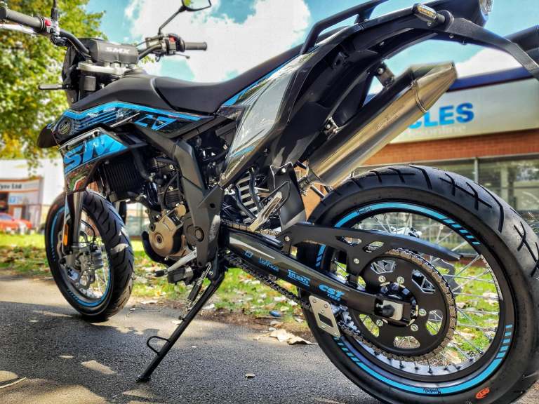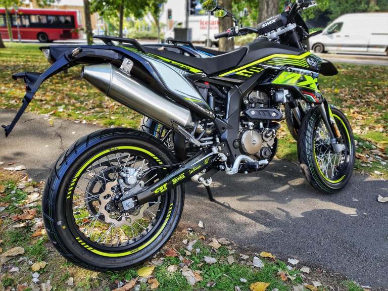 Are you looking for an off-road bike that's easy to use on the road? SMX 125 Motard is the answer. The SMX 125 Motard fits the gap between Road & Trail seamlessly, with sporty road tyres it grips the tarmac well making it ideal for a bit of urban exploration but still capable of going down a green lane or some mild off-road action. The Motard 125 is the perfect mix of advanced suspension, technology and a specifically tuned Aprilia based engine, the bike that enables you to enjoy the mud & the tarmac.
