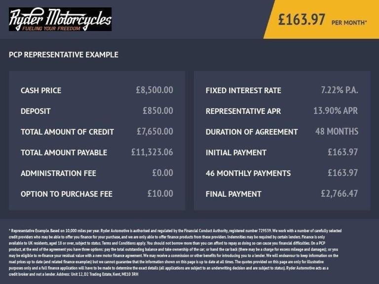 Ryder Motorcycles mdash; the Adventure Bike experts in the South East. We#039;ve worked with Close Brothers Motor Finance to bring you a range of incredible finance options on this bike. Questions? Just give us a call or send an email and we#039;re more than happy to help. If you want to see the rest of our stock and customer reviews, check out our website at [Website URL removed] you can also follow us on our Facebook page. Or even better, come along and see us.