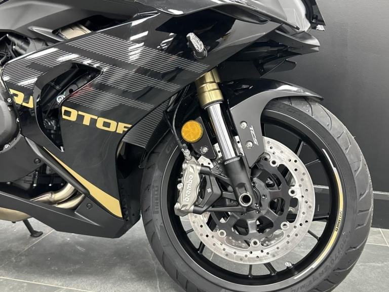 The brand new SRK 800 RR gives incredible feel from high-quality, Marzocchi adjustable front suspension and a Marzocchi adjustable shock absorber at the rear. The Brembo braking system provide superb stopping power with duel, 320mm discs at the front and a single 260mm disc at the rear. These features, combined with lightweight alloy wheels give an exciting and confident feel. The wheels are measured at 120/70 ZR17 for the front and 180/55 ZR17 for the rear. They're fitted with Pirelli Angel GT tyres.