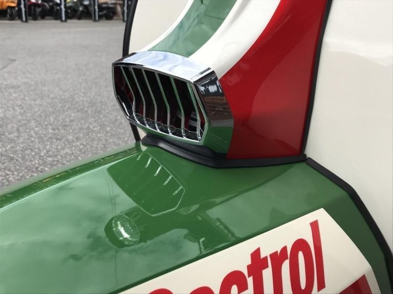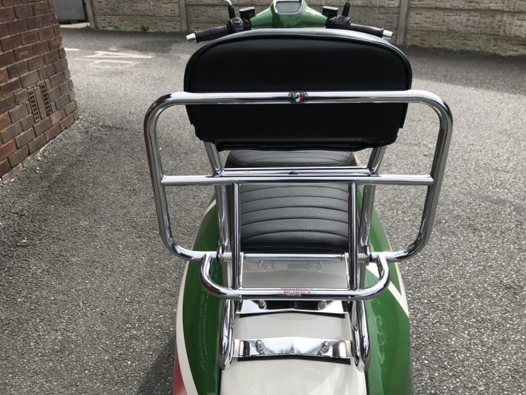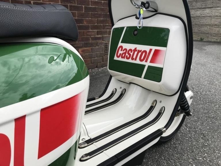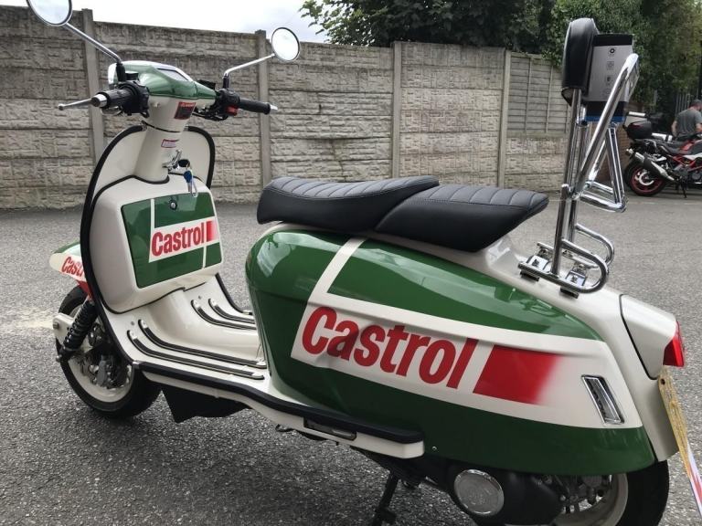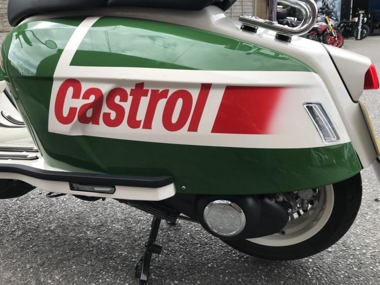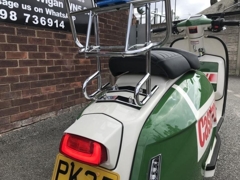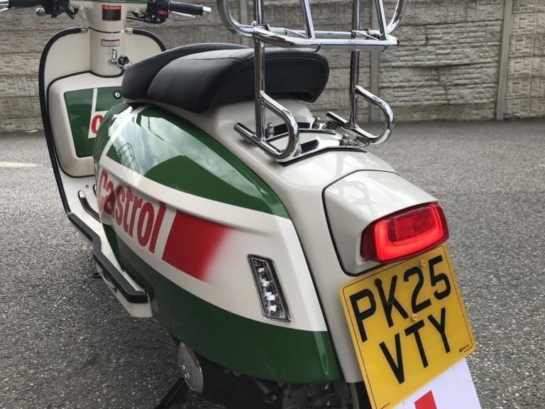 This scooter was reluctantly sold back to us because of a medical emergency for the previous keeper. Supplied by us a few weeks ago and fitted with a rear backrest and carrier. It comes with all the original documentation, both keys and is warrantied until 30-06-2027. Finished in the very popular Castrol racing replica colour scheme. The liquid cooled engine gives sharper power delivery and this is also the SE version with powder coated wheels and suspension, full stainless exhaust, longer arm chrome mirrors, rounder headlight and digital dash. Nationwide delivery, 15 month extended warranty with roadside assistance and finance available. Buy online at [Website URL removed] or call our sales team on 01942 218181 or WhatsApp [Phone number removed].