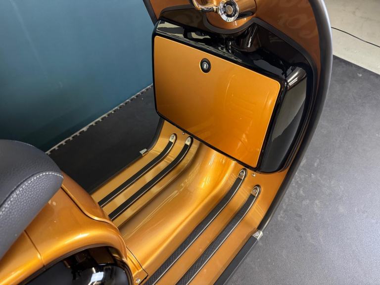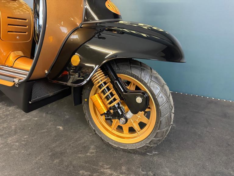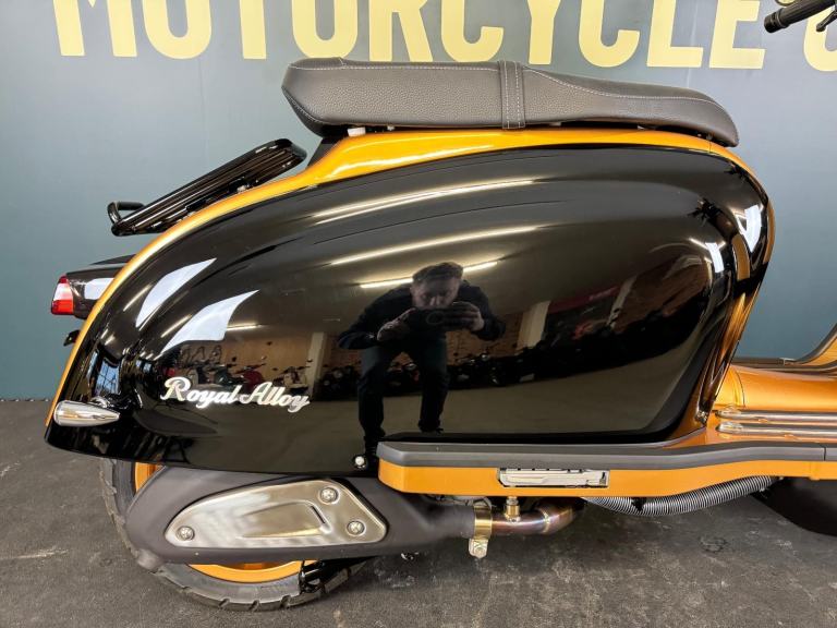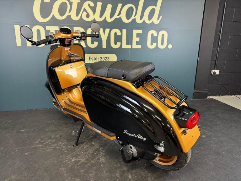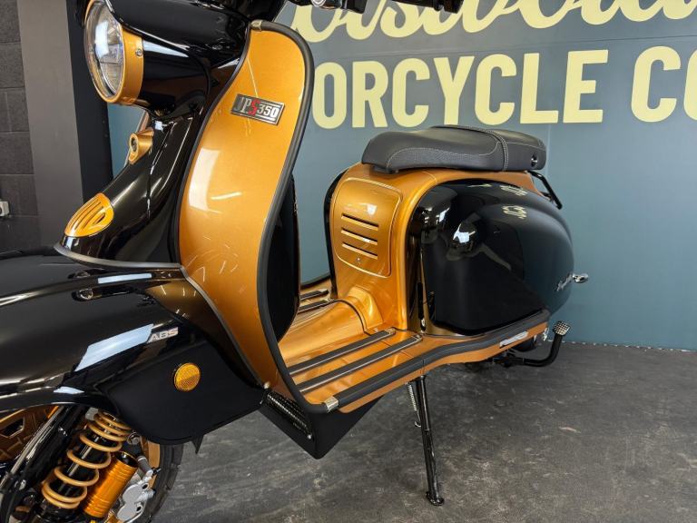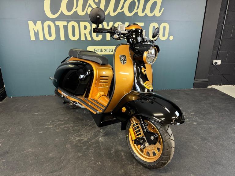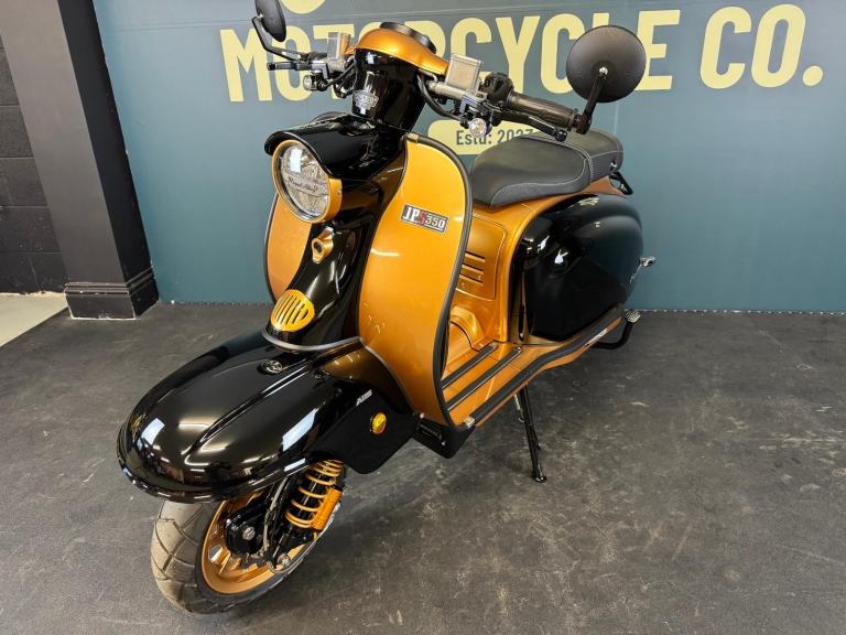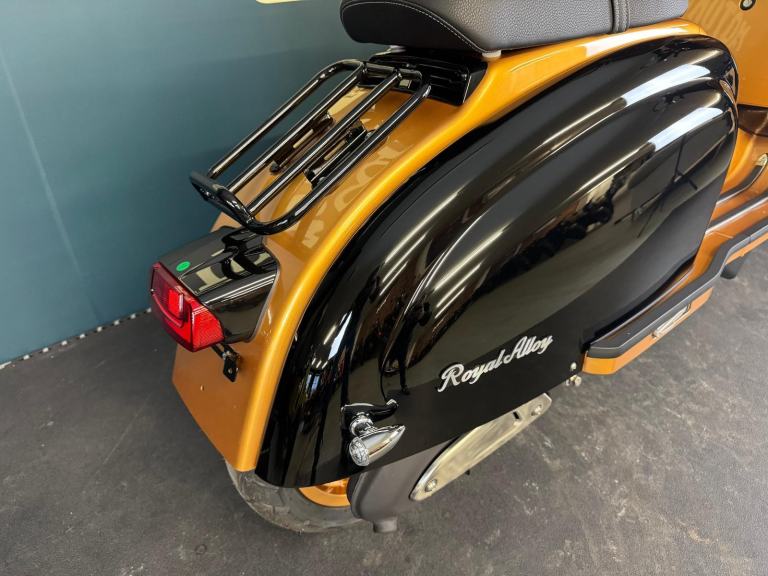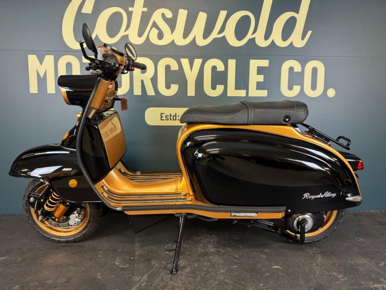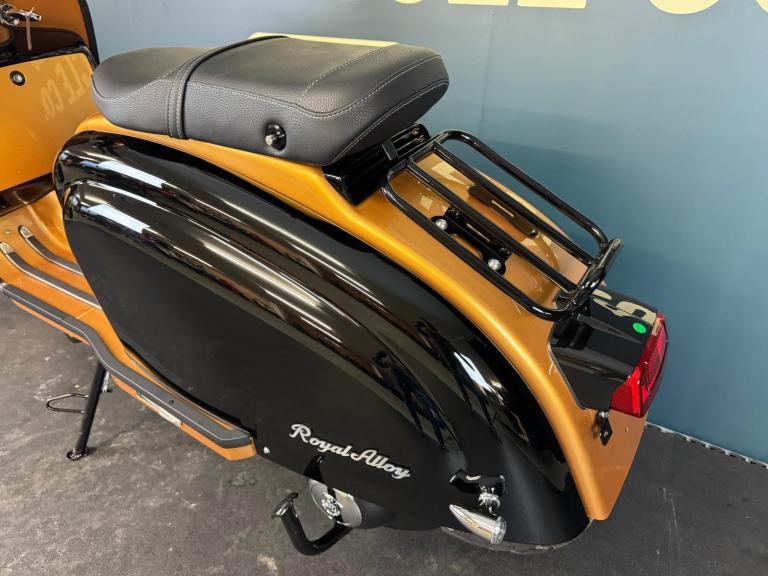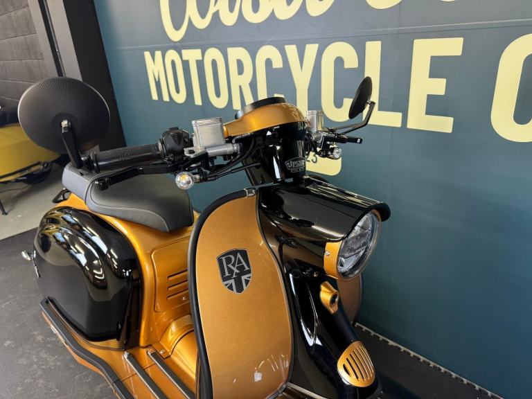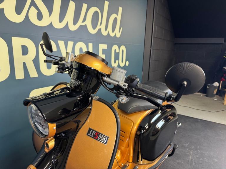 2025 Royal Alloy JPS 350 with ONLY 6 miles on the clocks! This bike is in the stunning black and gold and has bar end mirrors fitted plus black levers.
