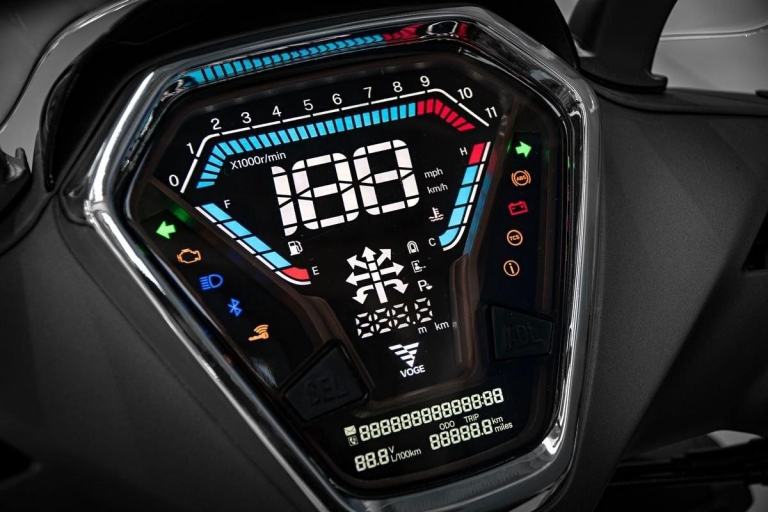 Its premium features include a large windscreen and removable handguards, keyless start, full LED lighting, an under-seat compartment with capacity for a full-face helmet, a glove box with USB socket and a colour LCD instrument panel with turn-by-turn navigation and a storage rack with a removable trunk. It also has an integrated HD camera for a fun and safe driving experience.