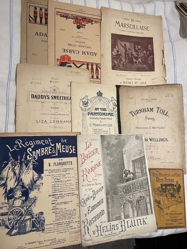 Grandmother’s music from her days in Paris London and Southampton. Some with song words too. Shows. Popular songs.Edward 7th coronation. Return from Boer war etc