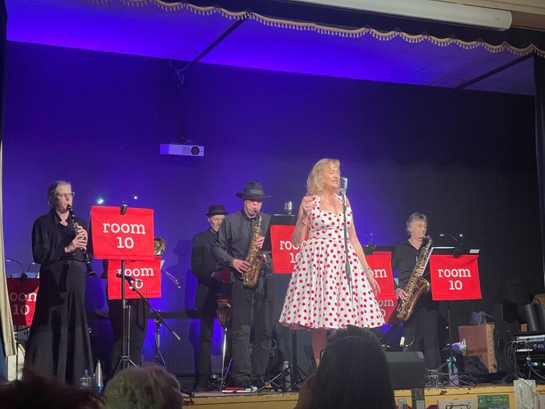 Hi! We're room 10, a swing band based in Yate and Bristol, We're made up of five saxes, clarinet, bass, keyboard, drums and female vocalist, and perform Frank and Ella type numbers - Come Fly with Me, Tuxedo Junction, Mack The Knife....stuff like that (people like to dance!)
