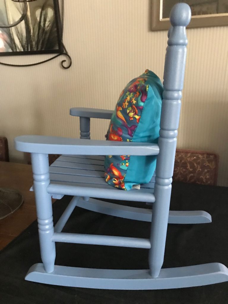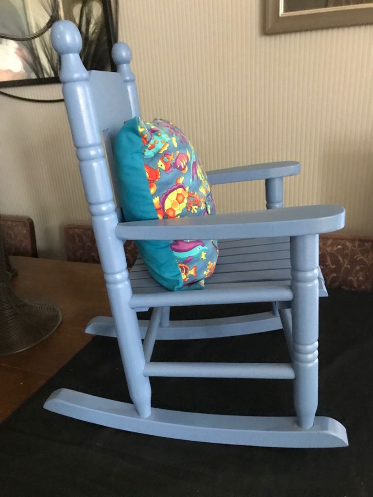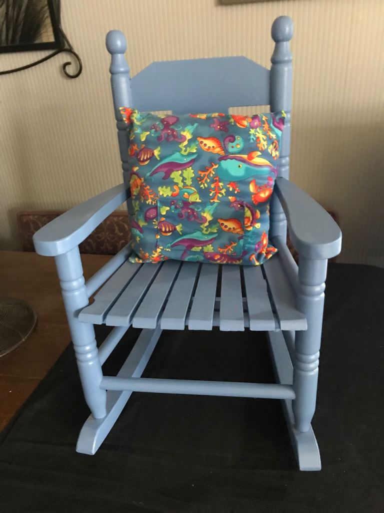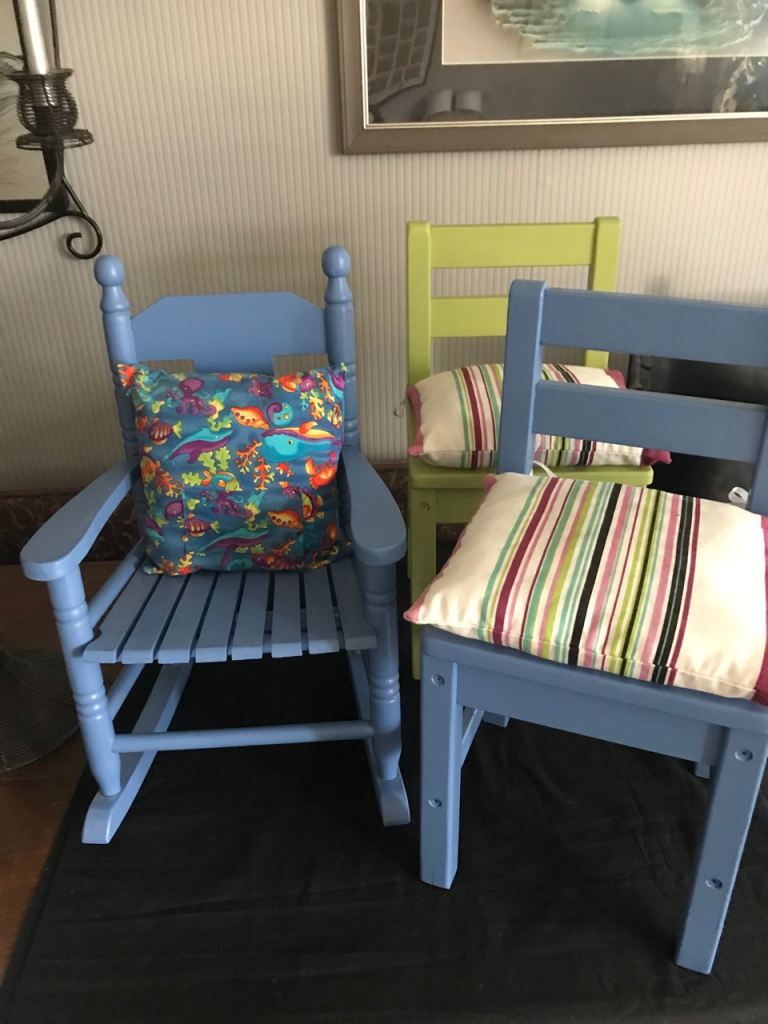 Rocker height to seat 10” - width chair 12” - seat depth 11” - overall height 23” - overall depth 18.5” - Chairs height to seat 13” - width 11.5” - overall height 22.5” - depth 11.5” - Collection only please. Newly refurbished with new cushions excellent condition price for all three items