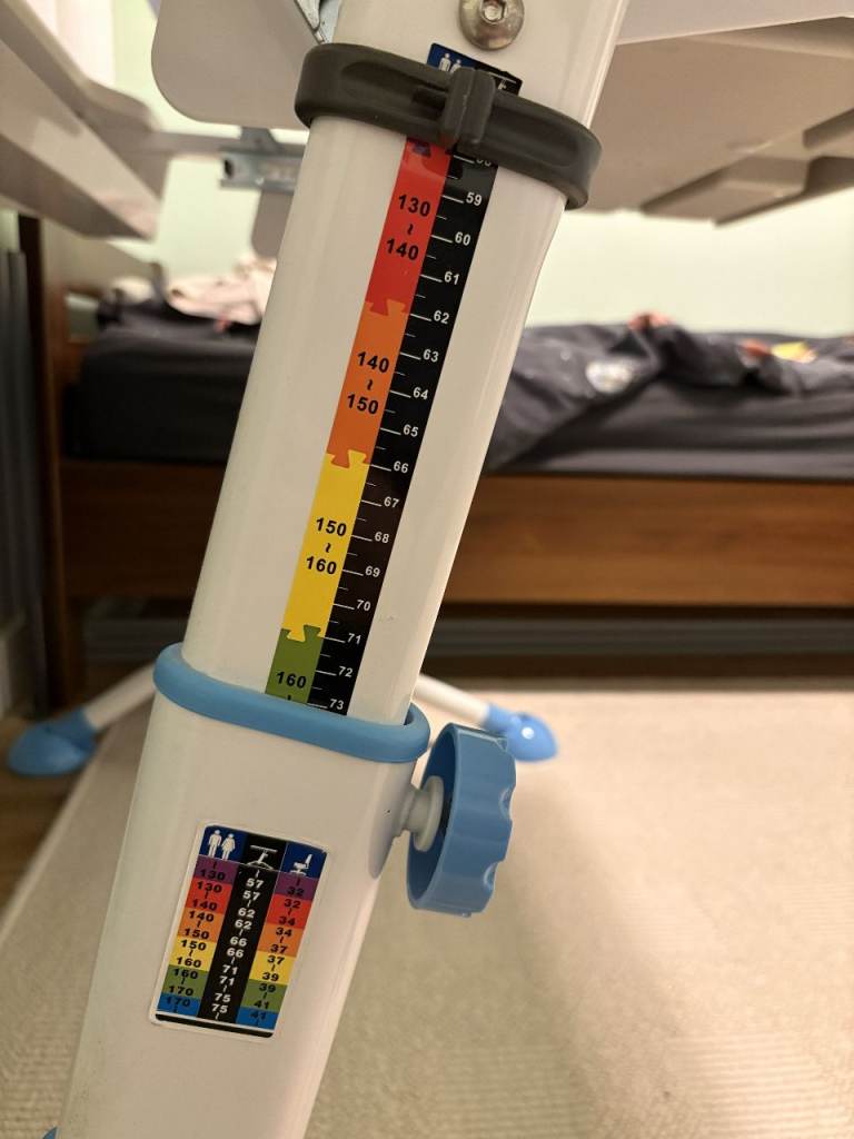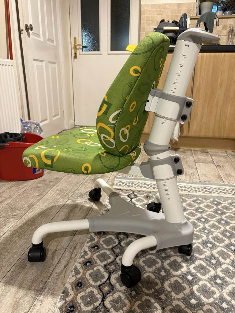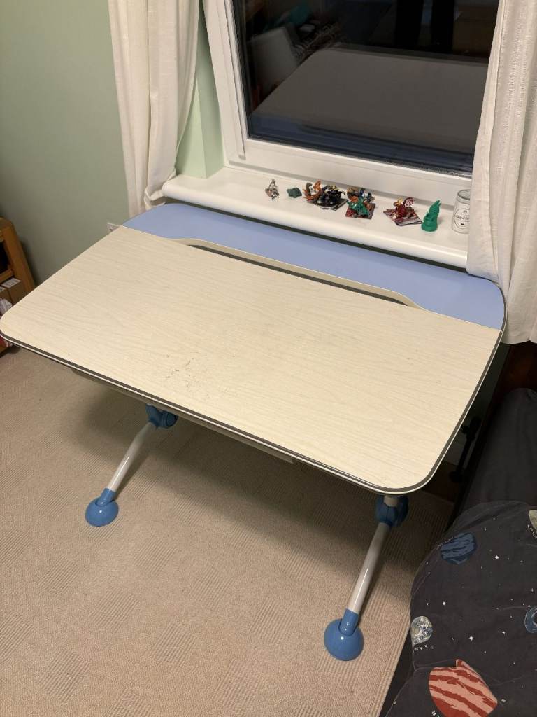 This is very sturdy piece of furniture for children. It is the only desk and chair you're going to need for your child from ~4yo until they get into mid teen age (14-15yo). My son used it from 4yo until 15yo, and only just now swapped it with adult desk/chair. You can adjust the height of both (check pictures). It's made of THICK steel and is indestructible. There are marks of wear, but nothing major. Also, there's an attachable shelf (attaches to the desk) - not shown on the picture, but will be supplied (is somewhere in my garage). The desk has many features:
