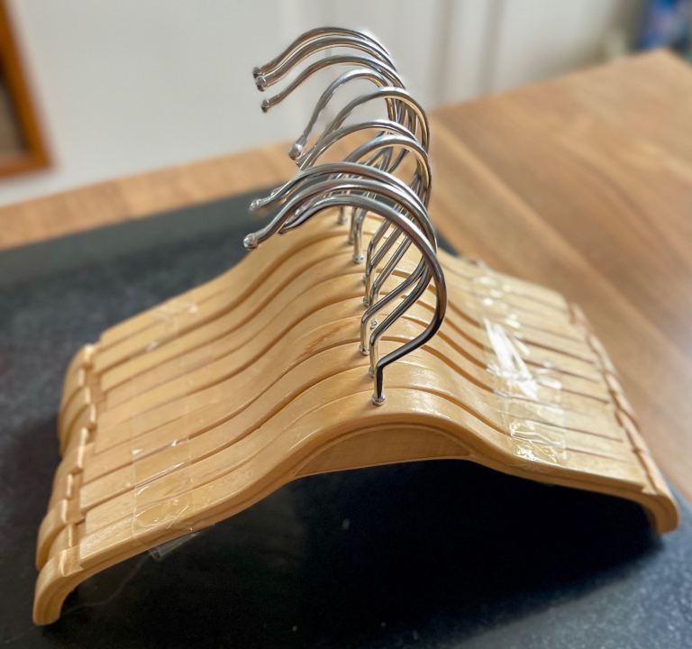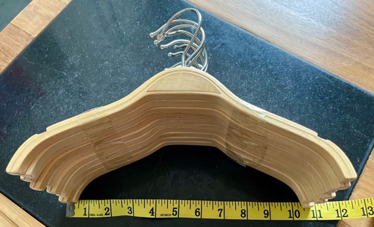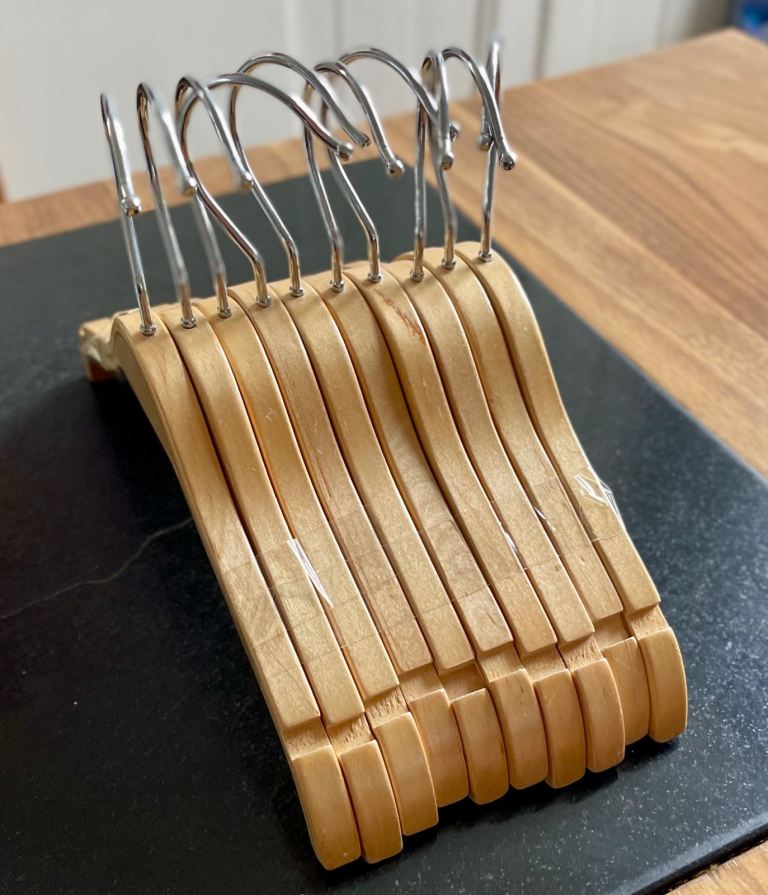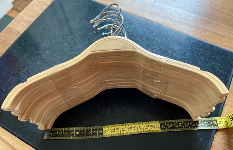 Wooden clothes hangers with notches, for shirts, dresses, jackets. No trouser bar. Smooth wooden finish so clothes don't snag. 11"/27cm approx across.