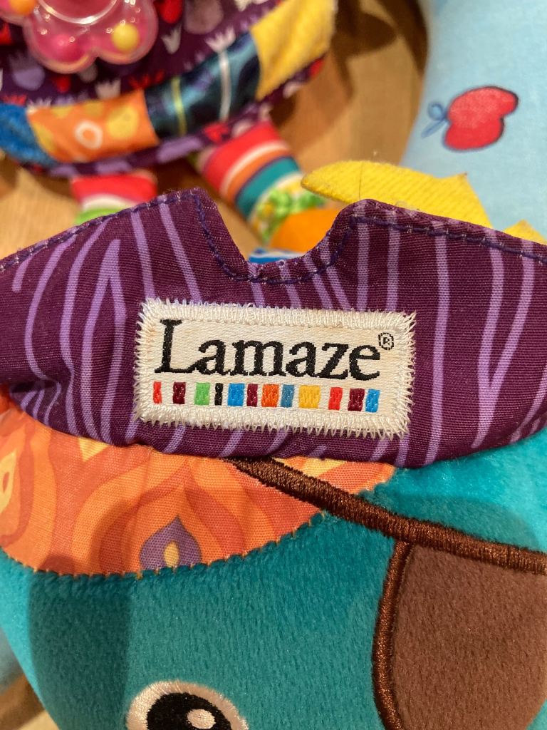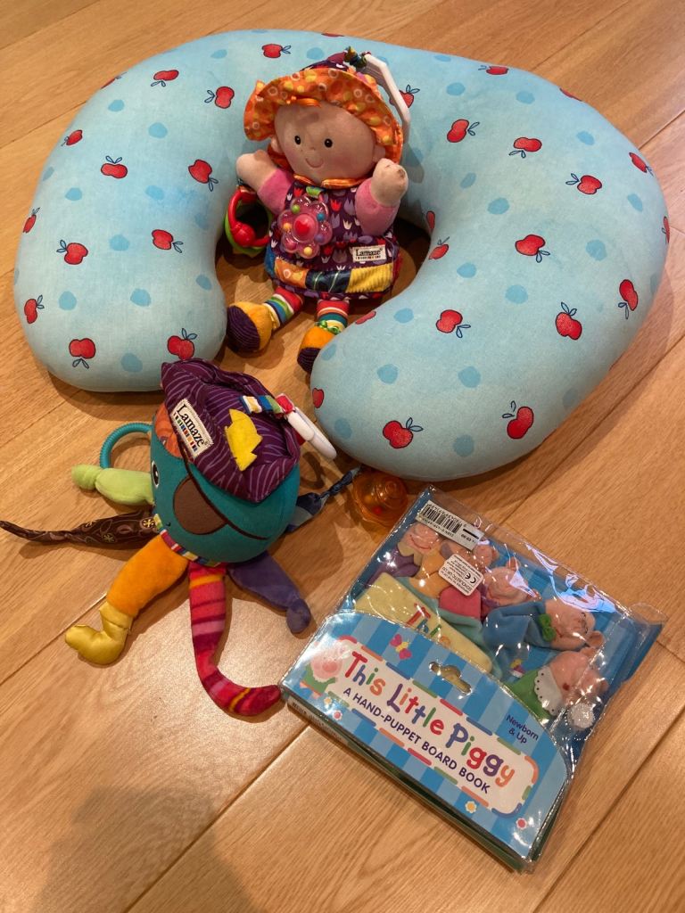 Set consisting of La Couche Nursing Cushon (Powder Blue with Red Apples) and two top quality Lamaze Soft Tops. Additional Glove Puppet still with its packaging also included
