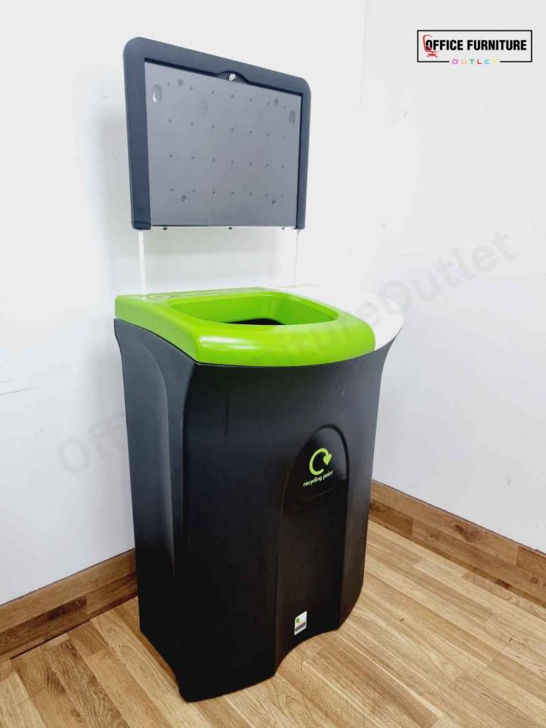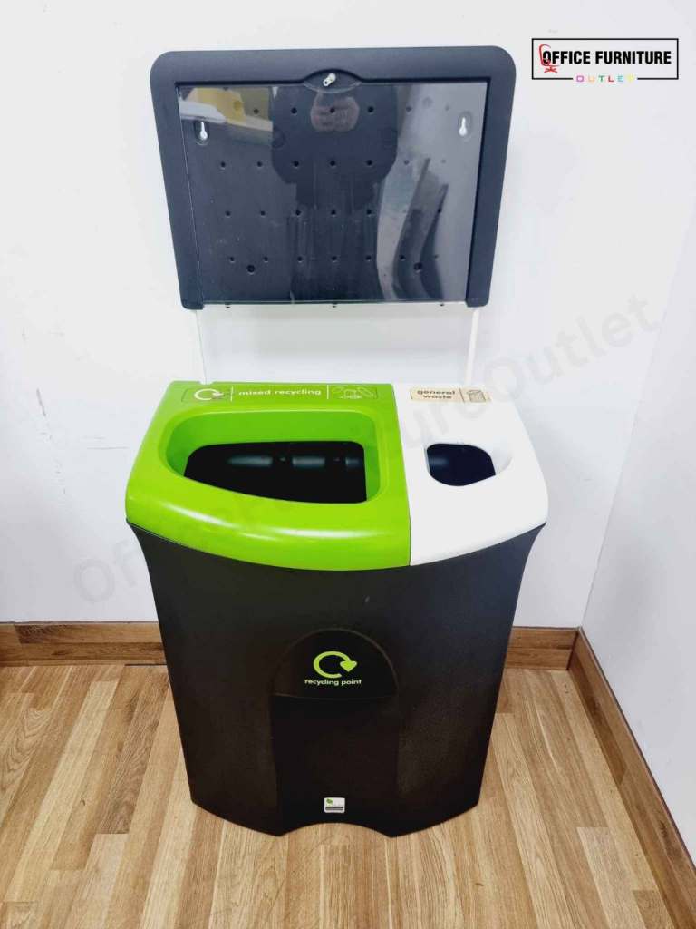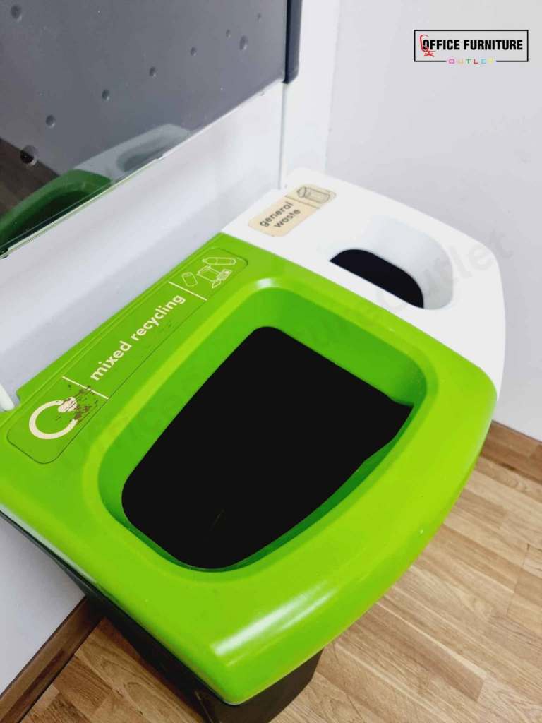 Keep your workspace tidy and eco-friendly with this practical dual compartment office bin. Designed for efficiency, it features a mixed recycling section on the left (green) and a general waste section on the right (white), making waste separation simple and effective. The attached signboard provides space to display custom waste disposal instructions or recycling guidelines, ensuring clarity for staff and visitors.