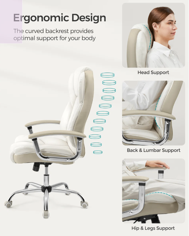 Optimal Ergonomics, the 360° swivel seat and ergonomically curved backrest of our computer chair promote the perfect posture, easing pressure on your spine, shoulders, and back boosting your productivity with enhanced comfort