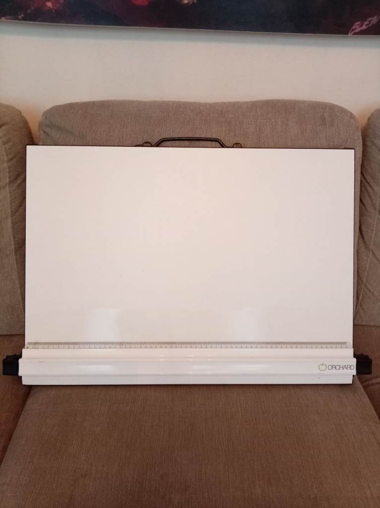 Architect or artist drawing board with ruler. Orchard. Surplus to requirement. Good working order. Expensive to buy new. Width 65cm. Height 47cm.