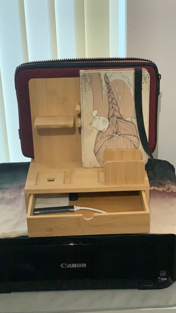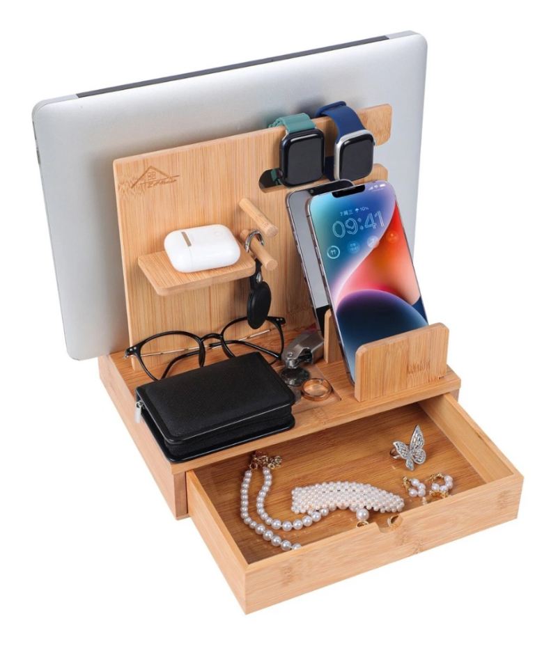 These are high quality wooden docking station stands made from bamboo. They are designed to neatly hold a phone, wallet, keys, watch, gadgets and can also be used as a desk organizer or laptop companion stand. Ideal for home, office, gifts or resale.