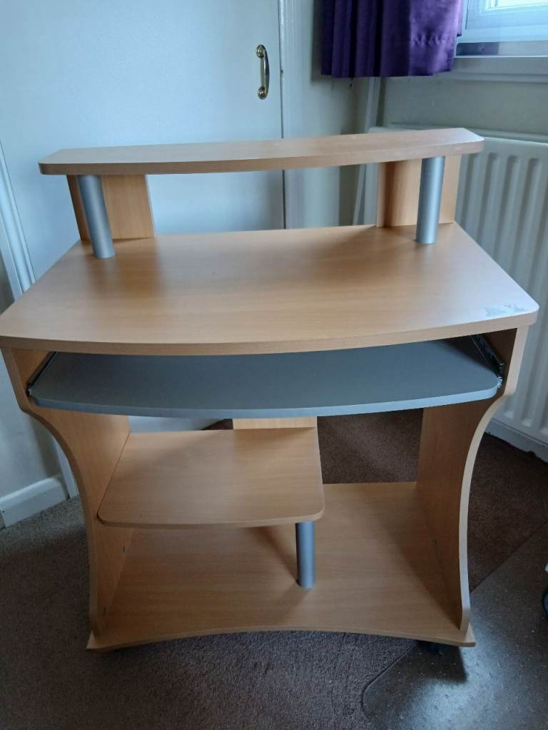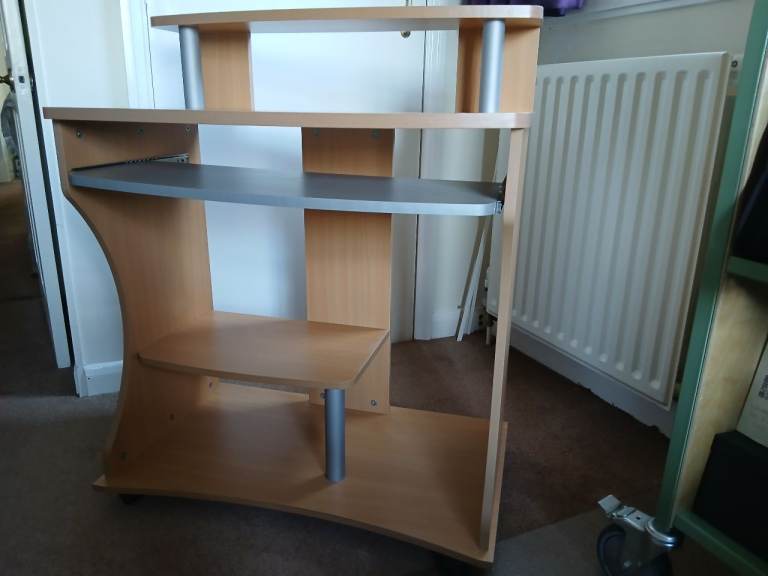 Computer table/trolley: 75cm side to side, 50cm front to back, 91cm at the highest point which is the monitor shelf. The keyboard shelf pulls out, and adds another 25cm front to back. Ergonomic design, with shelves for monitor, laptop and keyboard each placed at a different height. See photos. Came from Office World on Greenwich Peninsula, just before it closed. All clean and works well. One wheel makes a squeaky noise but it still works fine. One of the pull-out arms for the keyboard shelf needs fixing, but it still works. Please bring a friend to help you carry it downstairs, it's on the first floor. And it's free !
