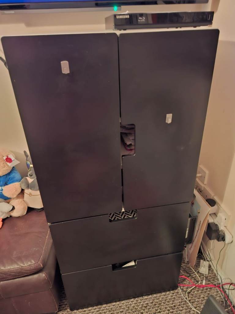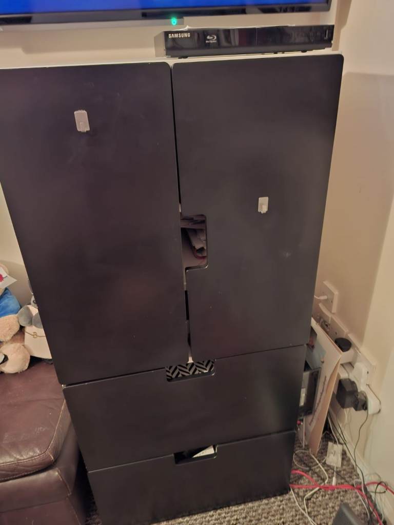 Nice sturdy black and white sided cabinet 3 shelves in side 2 large draws very clean condition no pets
