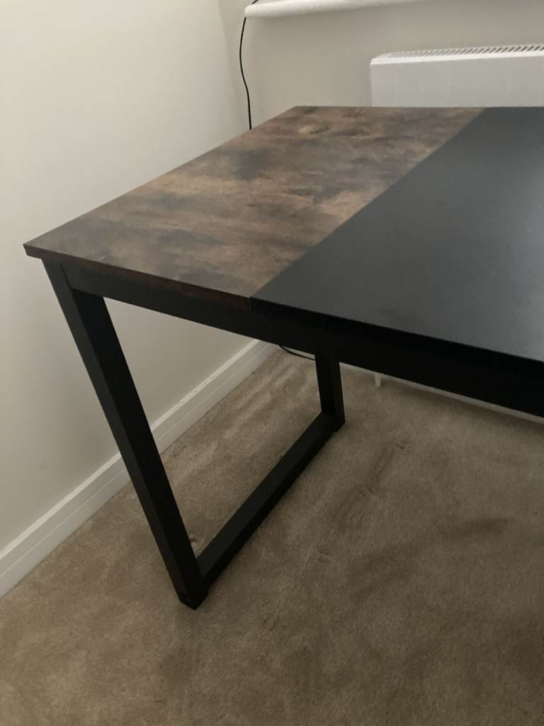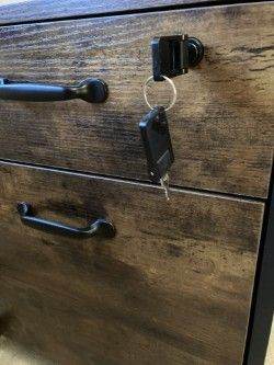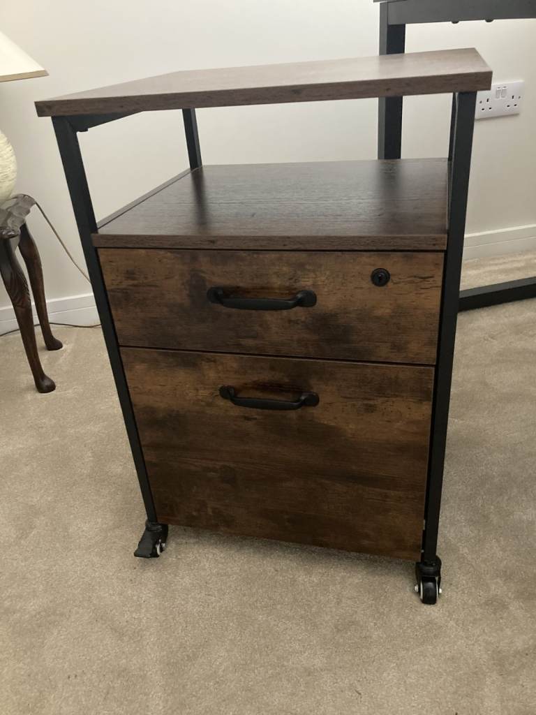 Computer desk and 2-drawer filing cabinet in rustic wood-grain look. Attractive brown and black finish. Black metal frame. Cable holes in desktop. Adjustable pads at bottom of desk legs. Lockable cabinet - 2 keys.