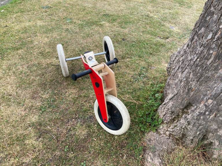 The Wishbone bike setup in trike format with a new & sealed rear axle kit (short) to convert to two wheels as your child grows.