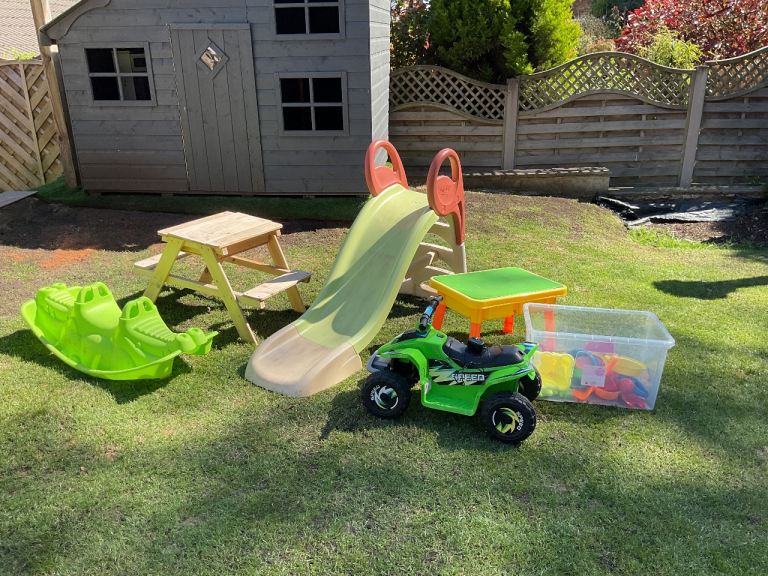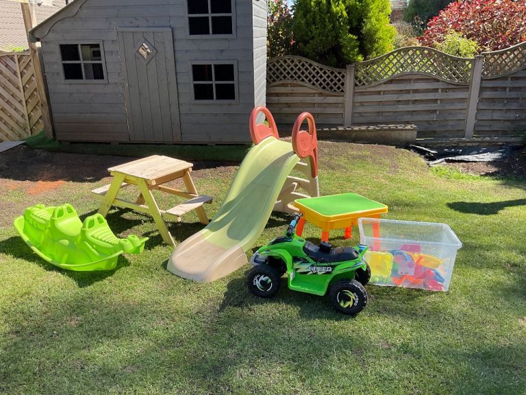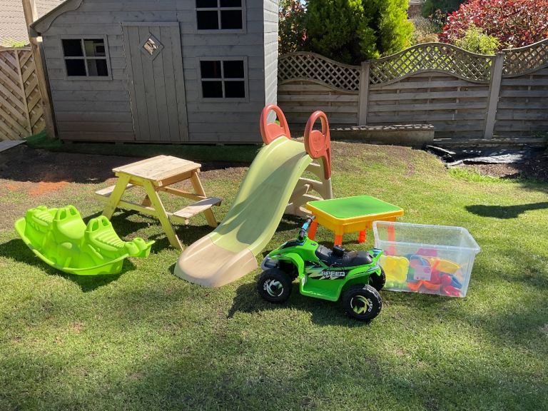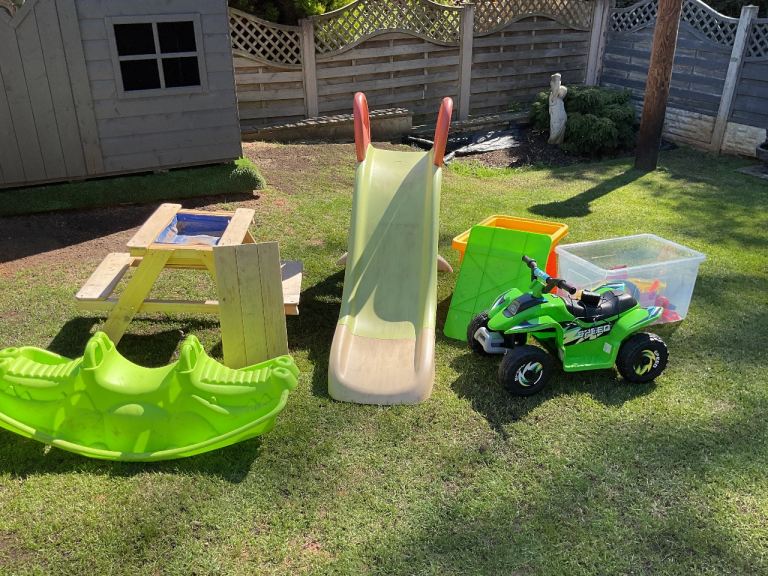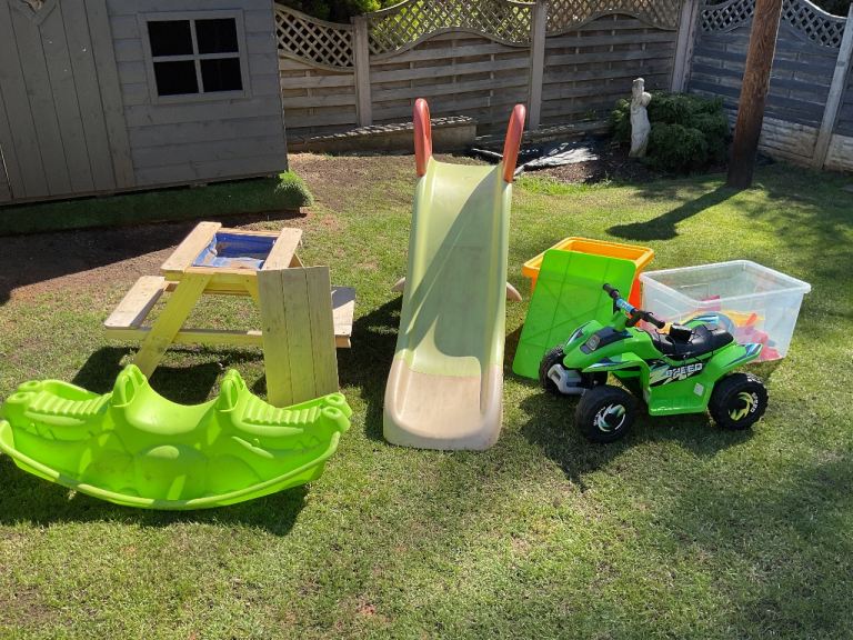 2 sandpits one is a wooden pick nick bench, slide connects to hose pipe, seesaw electric quad bike, and a box of sandpit toys as new bargain