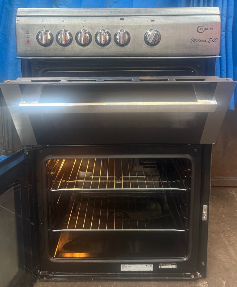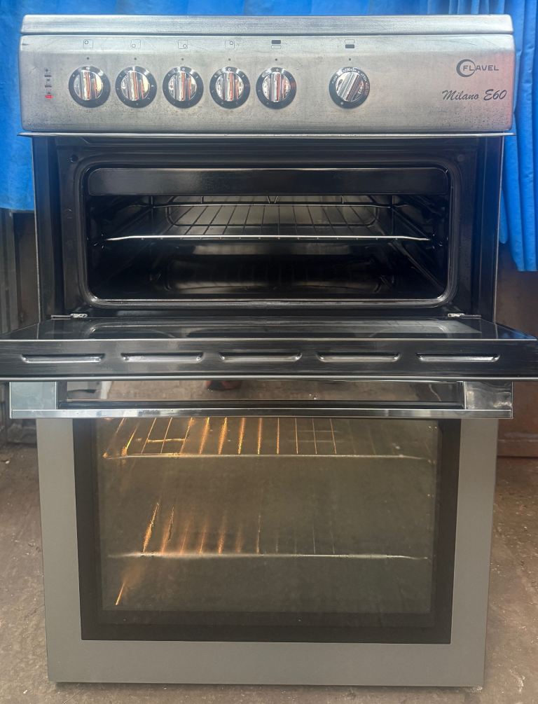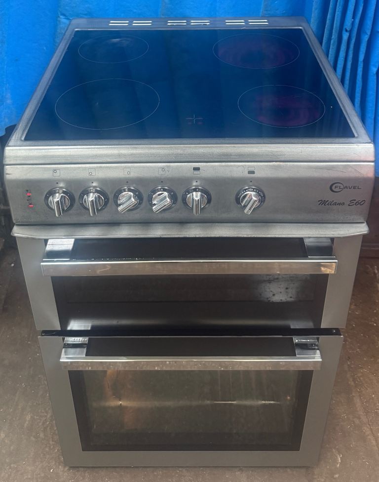 Hello welcome to my ad,This flavel ML61CDS 60cm double oven electric ceramic cooker comes in an silver colour with four ceramic hob,double glazed door and viewing windows ,removable inner door glass for easy cleaning, interior light in the main oven,slow cook and defrost function,catalytic liners in both ovens making cleaning easy,three shelves ,stylish knobs,easy clean enamel,Main oven is electric fan assisted oven with a cooking capacity of 71 litres usable while second oven (Top) an electric oven with integrated variable electric grill 35 litres cooking capacity,interior cooling fan very clean and tidy dimensions are H:900 W:600 D:600 cash on collection at B18 7QD 71 - 79 western road or delivery for extra fee,for more details message me thanks .