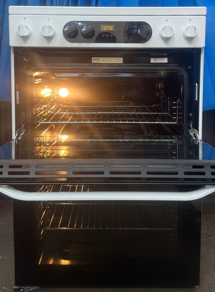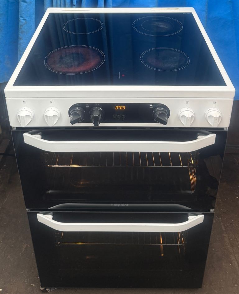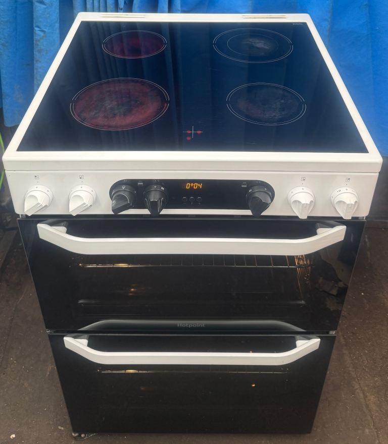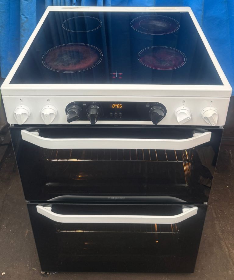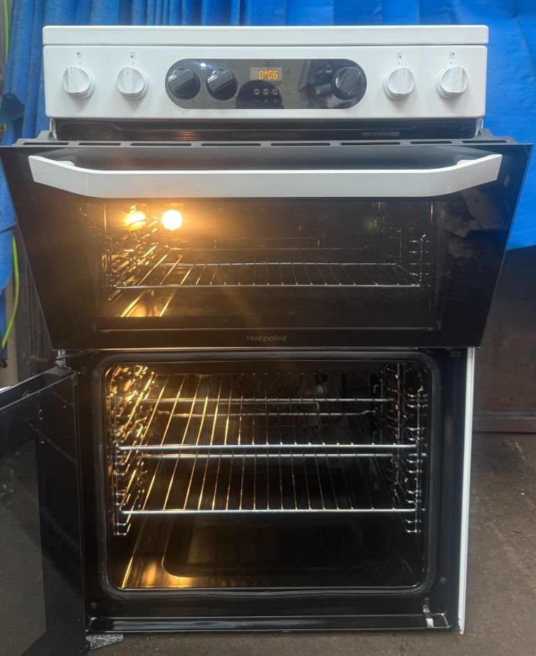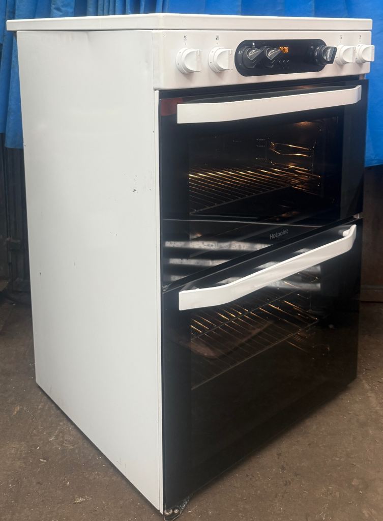 Hello welcome to my ad, this Hotpoint HDM67V9CMW 60cm double oven electric ceramic cooker comes in a White colour with four ceramic hob,hot hob indicator,programmable timer and minute minder for the main oven, double glazed door and viewing windows, removable inner door glass for easy cleaning,slow cook and defrost function,catalytic liners in both ovens making cleaning easy,easy clean enamel,interior light in both ovens,grill pan and handles,stylish knobs,main oven is electric fan assisted oven oven with 77 litres cooking capacity while second oven (Top) is electric oven with an integrated variable electric grill which has 51 litres cooking capacity,cooling inner fan and dimensions are H:90cm W:60cm D:60cm very clean and tidy cash on collection at B18 7QD 71-79 western road or delivery for extra fee, for more details message me thanks.