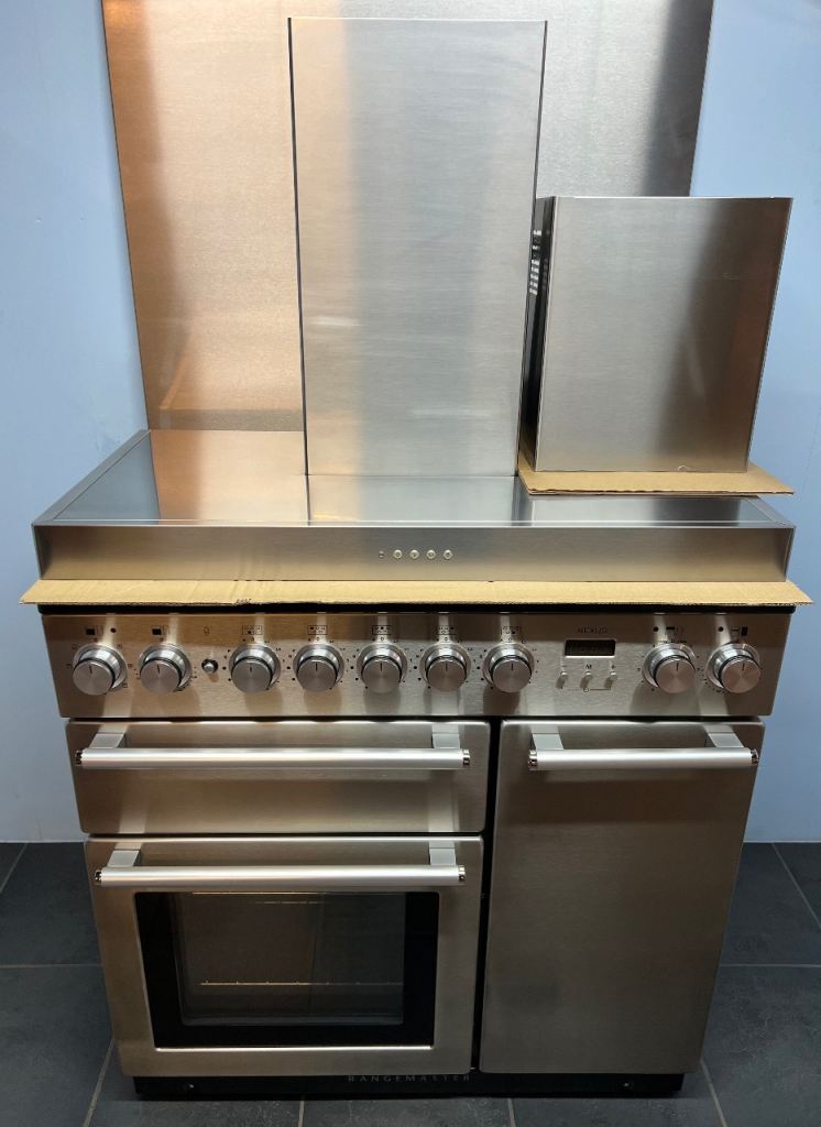 RANGEMASTER NEXUS NEX90EISS 90 CM⚡️INDUCTION⚡️ RANGE COOKER IN STAINLESS STEEL AND CHROME TRIM. + RANGEMASTER CHIMNEY HOOD 90 CM IN STAINLESS STEEL + SPLASH BACK 90 CM IN STAINLESS STEEL.
