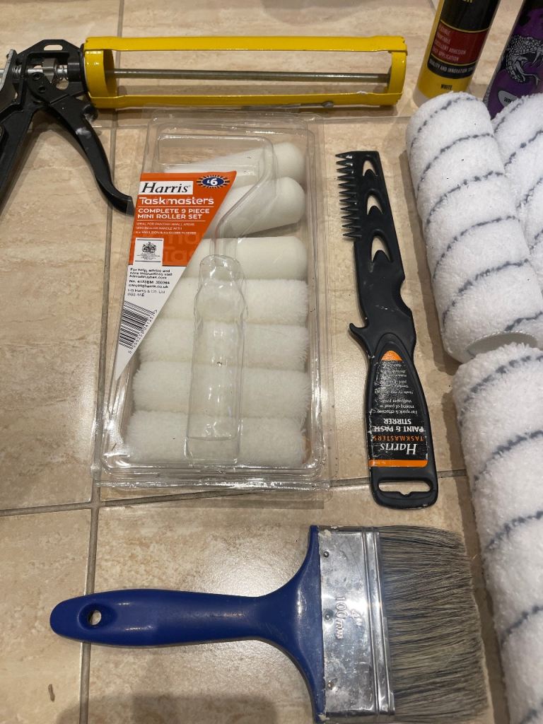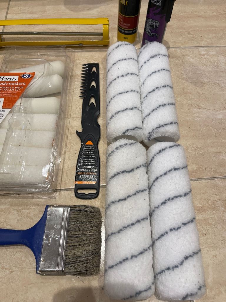 Comprising 4 x large rollers, 7 small rollers, 2 x decorators caulk and gun, paint/paste stirer and 4” (100mm) paintbrush.