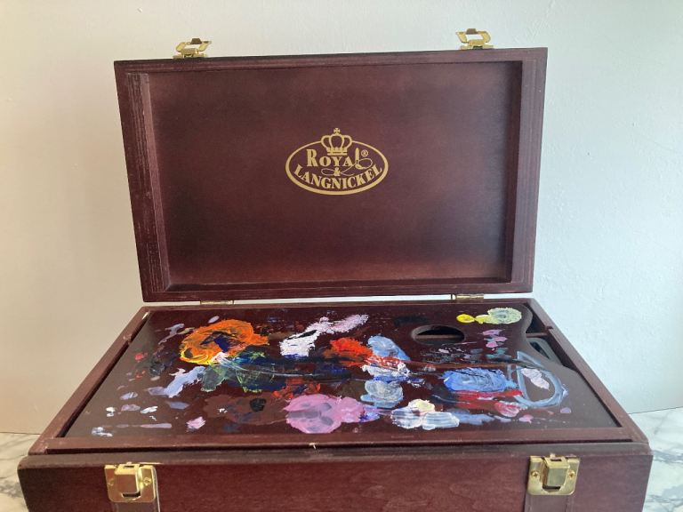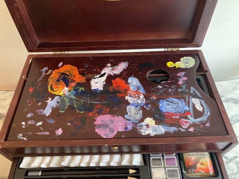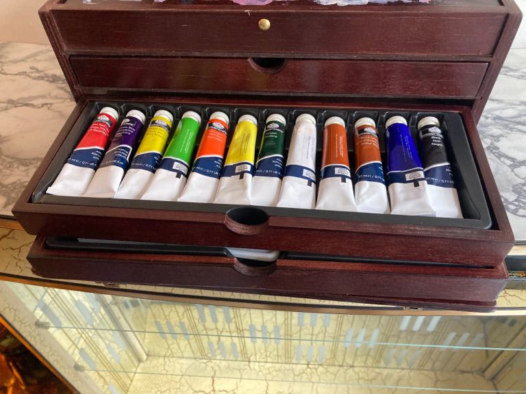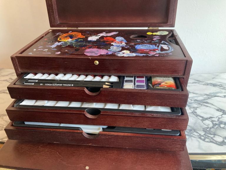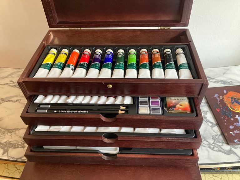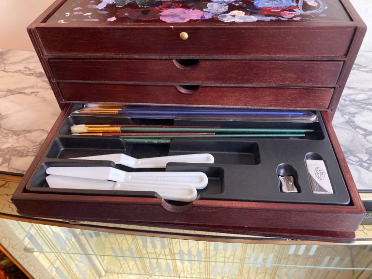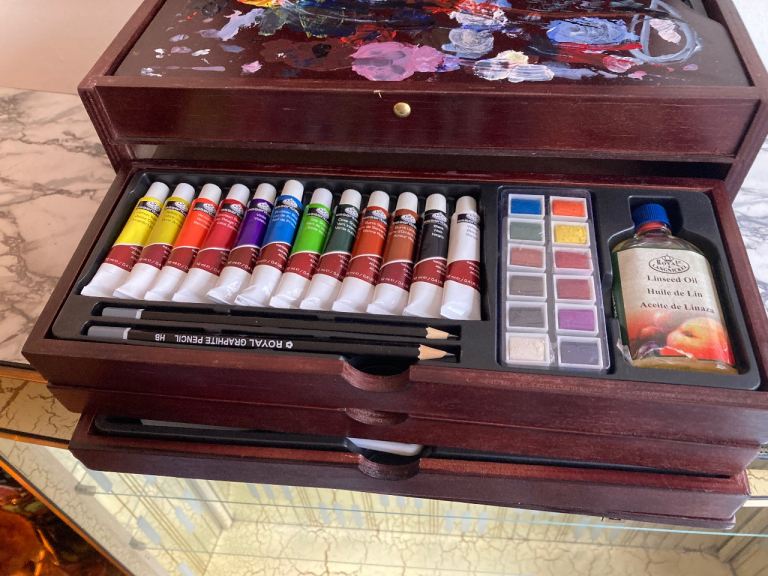Fabulous painting set..37 cm wide, 22 cm across, 18 cm tall…36 paints. 14 brushes, linseed oil, pencils, sharpener, rubber, 3 sets of drawers, each opens out, with easel..great hobby, de stressor..good condition, majority of paints and brushes unused Notting Hill pick up, cash only, worth over £100, selling for £20 due to house move …thanks for viewing ..Royal Langnickle is the brand