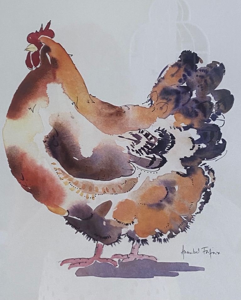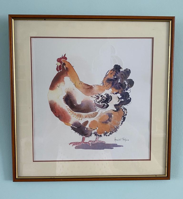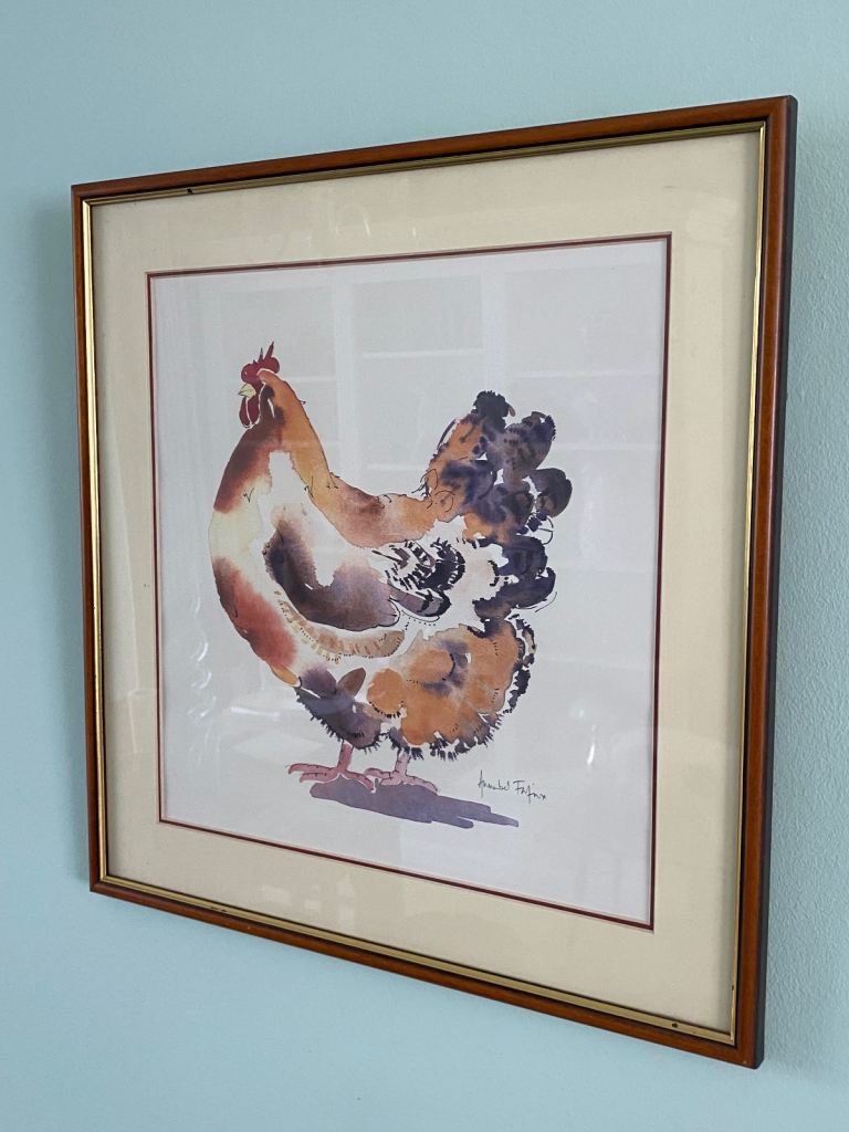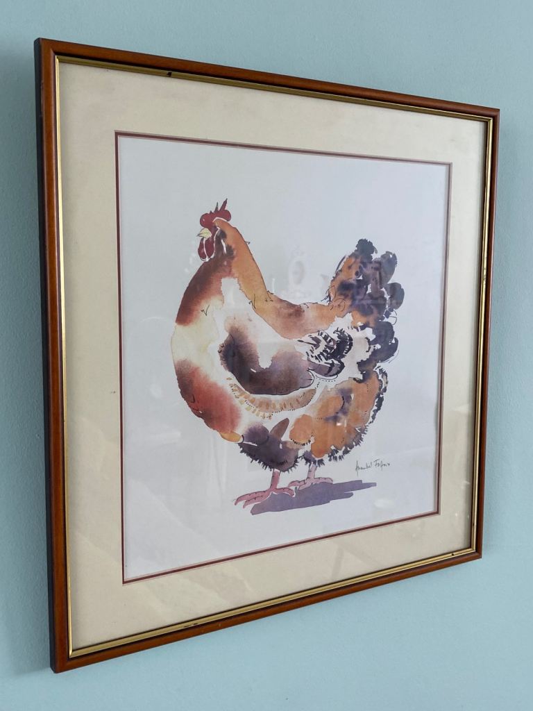 “PURPLE HEN” CHICKEN BIRD PRINT BY ANNABEL FAIRFAX IN GLAZED FRAME.