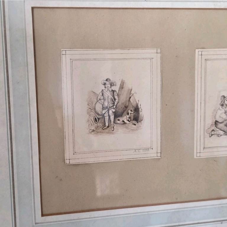 The product is a pair of antique drawings marked "A.E 1838" featuring a framed portrait of a lady and possibly a rat catcher. These drawings are genuine pieces from the year 1838 and are framed, adding to their historical and collector's value. The subjects of the drawings are focused on ladies, giving them a unique and vintage charm that would appeal to art enthusiasts and collectors of antique artwork.