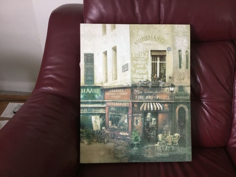 2 canvas prints of French cafe scenes. Size 51 cms x 41 cms. Excellent condition. Brought back from our French house. Pick up from Henwood, between Wootton and Cumnor.