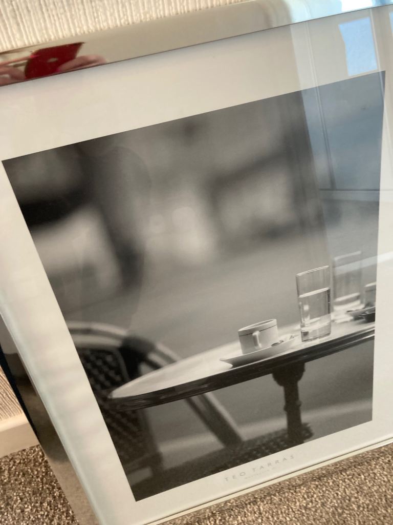3 Mediterranean cafe prints in black and white with silver coloured frames 21”x17” - very good condition - pick up only please
