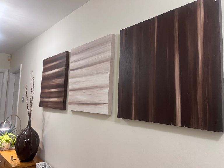 3 contemporary canvas art work, looks absolutely stunning on a light shaded wall. Can be sold separately at £15 each. Hand painted