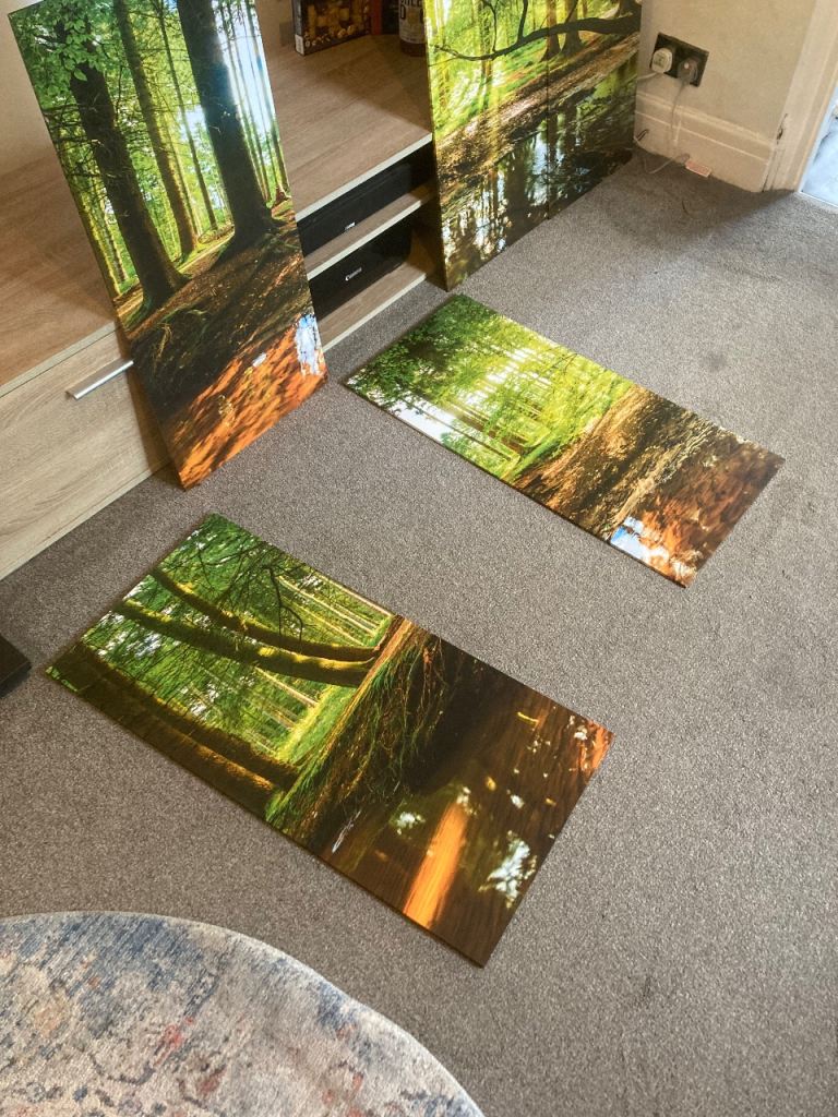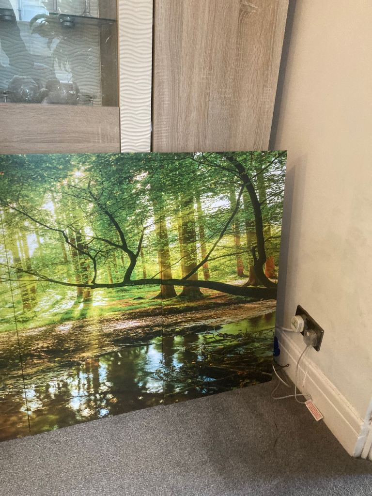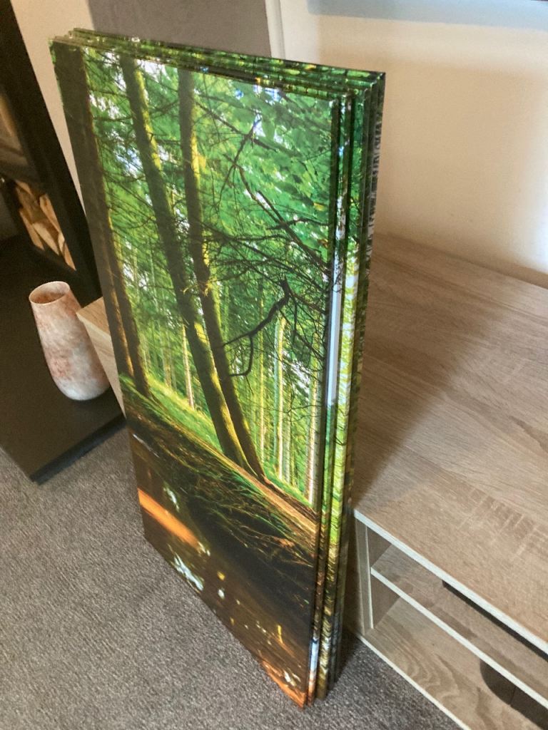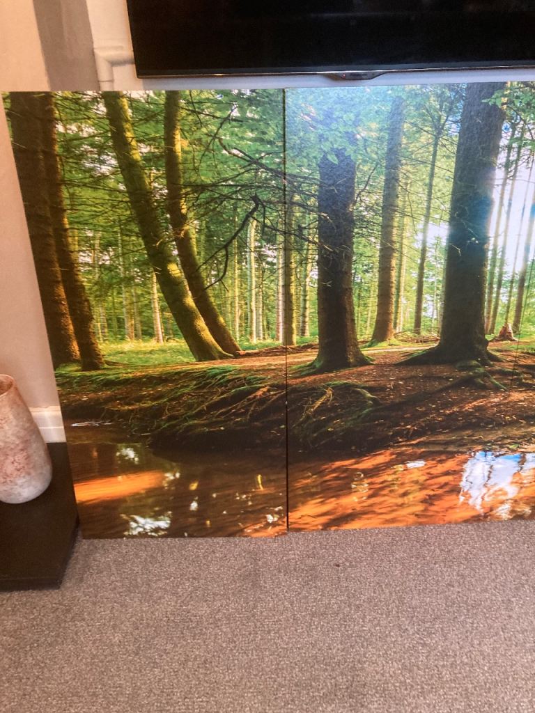 A photo print of a forest scene across 5 separate panels. These are hung using standard picture hooks and have the fittings on the back. Panels are numbered in order. Each panel is 40cm wide by 80cm tall. Looks great when hung up. In great condition and from a smoke free home.