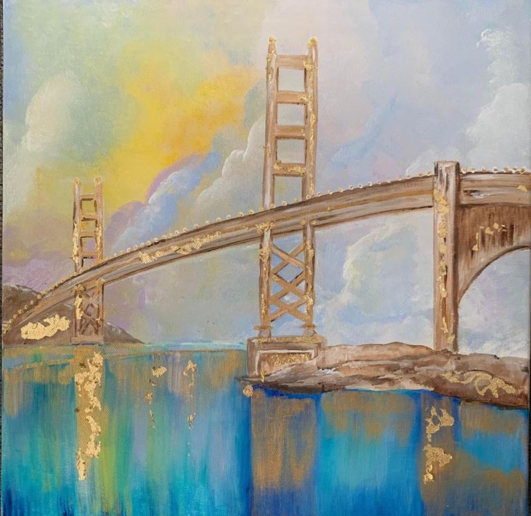 This original acrylic abstract painting of the Golden Gate Bridge is a beautiful fusion of modern technique and timeless scenery. Painted on stretched canvas, the piece showcases the iconic bridge with a masterful balance of structure and fluidity. The gold leaf accents add a luxurious touch, catching the light and creating a dynamic play between shimmer and shadow, particularly in the reflection on the water. The sky, rendered in soft pastel hues, suggests a serene morning scene where the sun attempts to break through the mist, adding a delicate warmth to the atmosphere. The painting is elegantly framed in a white boxed frame, which enhances its contemporary feel while allowing the artwork’s vibrant yet tranquil qualities to take center stage. This piece invites viewers to immerse themselves in the interplay between light, texture, and the iconic beauty of the Golden Gate Bridge.
