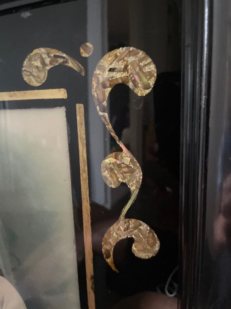 • Medium: Reverse glass print with gilt & mother-of-pearl decoration