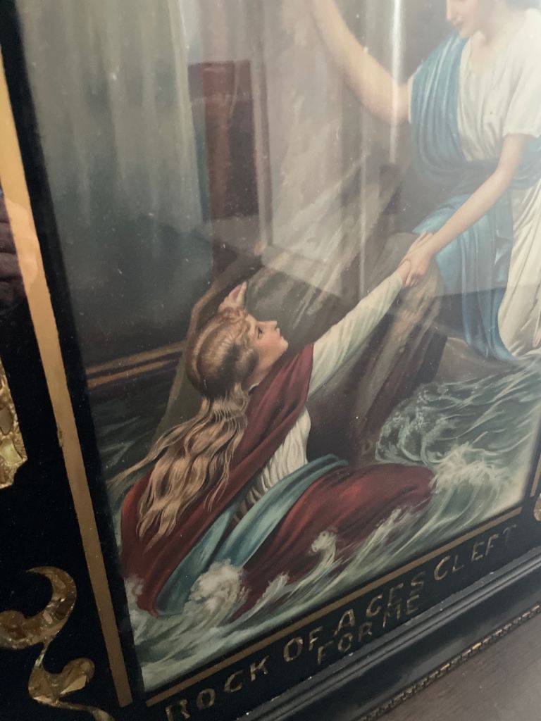 Beautiful late 19th / early 20th century Victorian devotional reverse glass print, titled “Rock of Ages, Cleft for Me.”