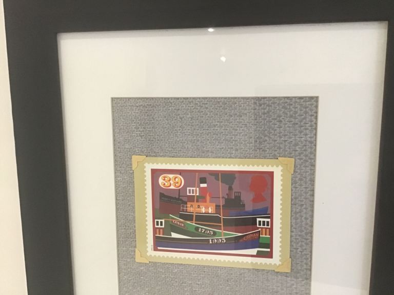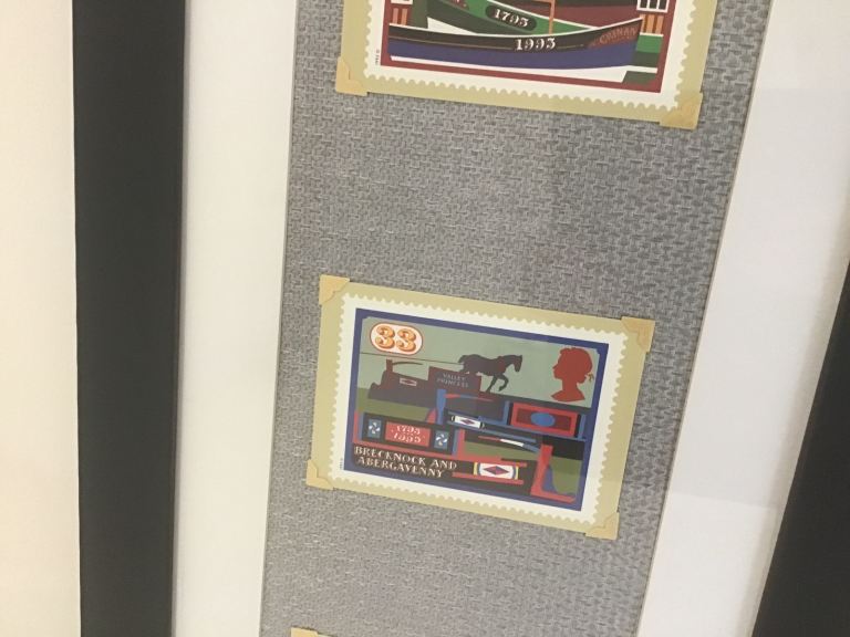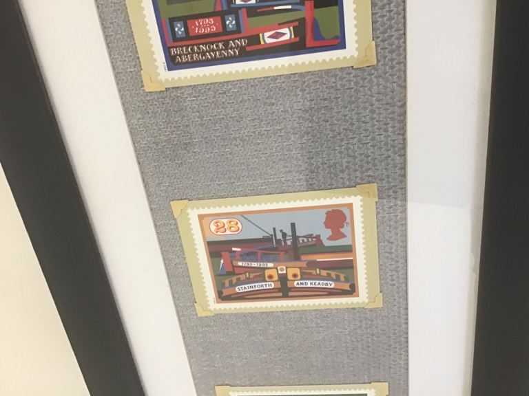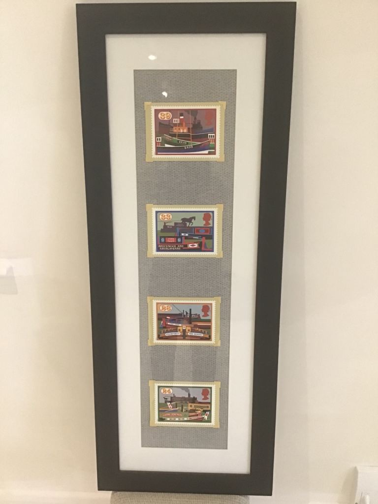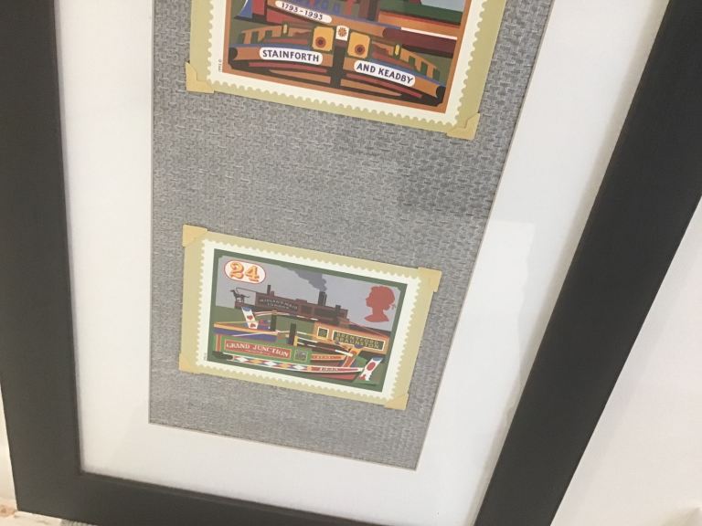 ROYAL MAIL STAMP SERIES PHQ ….INLAND WATERWAYS 1993 CANAL BOAT POSTCARDS MOUNTED IN A MATT BLACK FRAME.