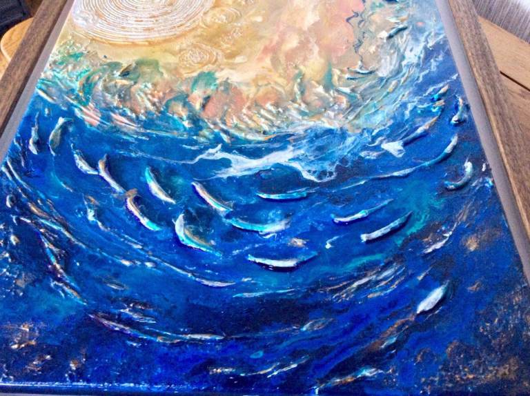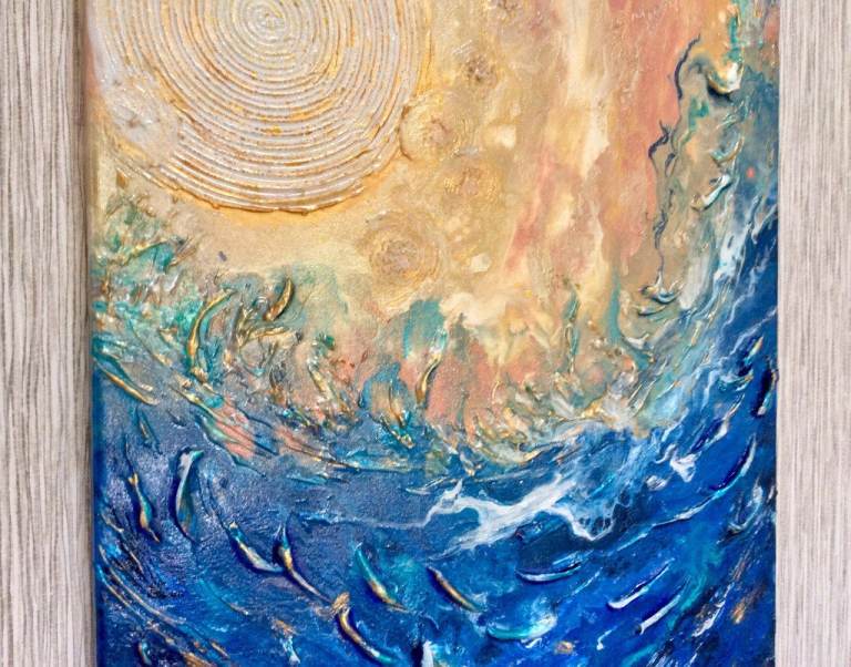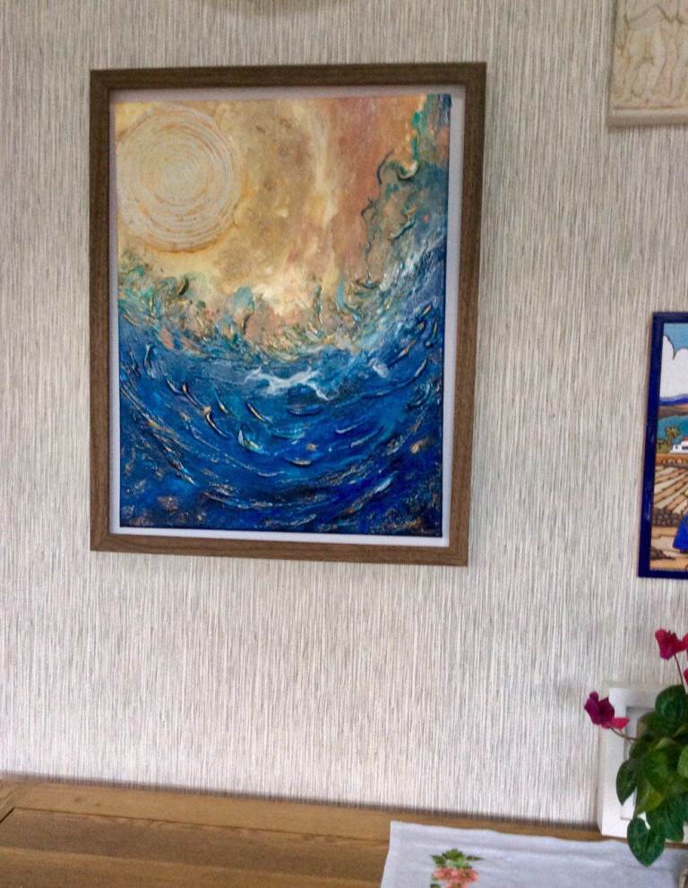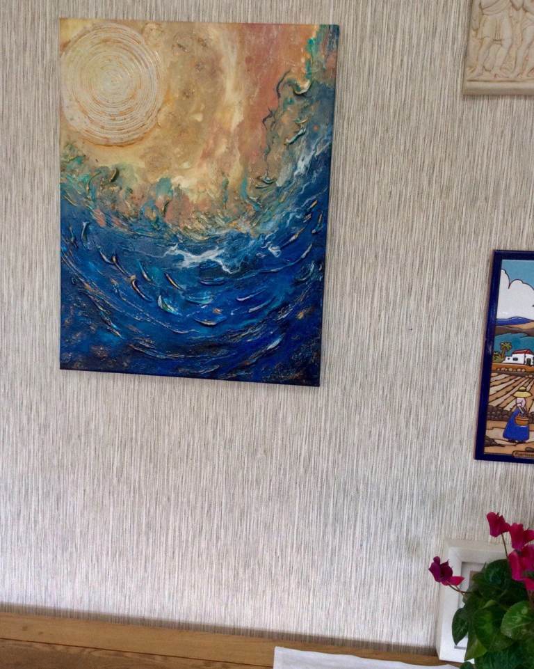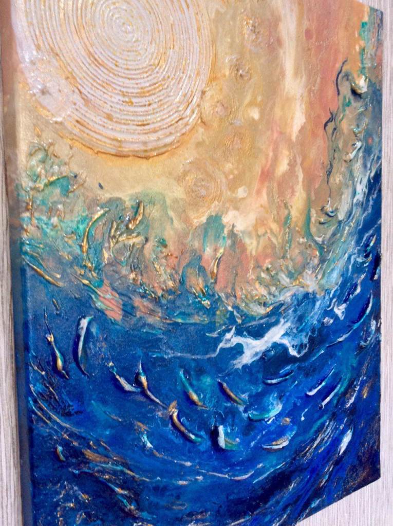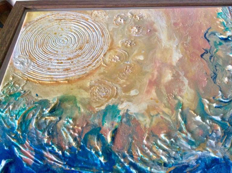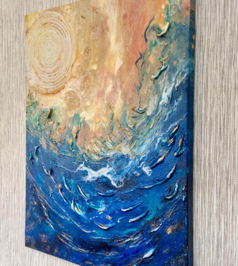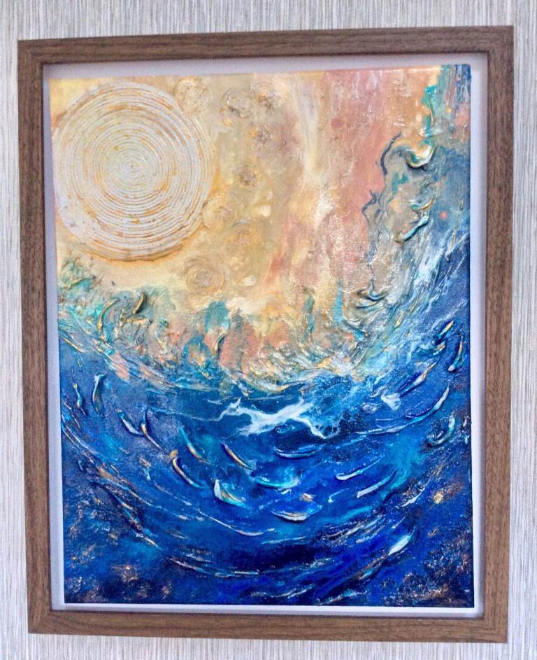 35 by 50 cm, on stretched cotton canvas, acrylics and texture, varnished and ready to be displayed. Unframed but can supply a frame (pixtured) for additional charge.