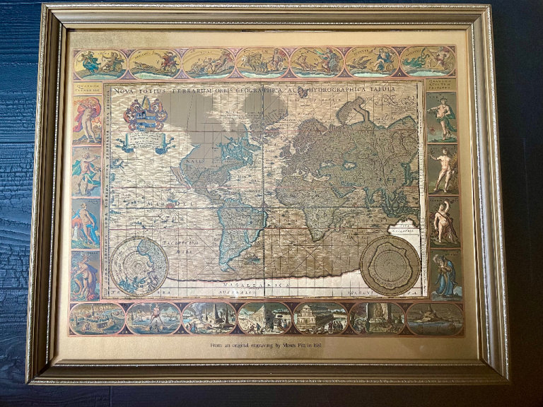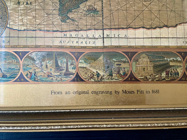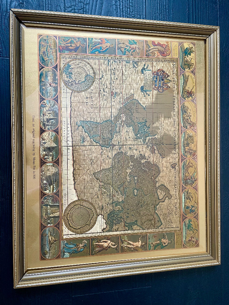 This is a stunning gold foil etching of Moses Pitt's 1681 World Map. Approx size 25'' x 21'' including frame.
