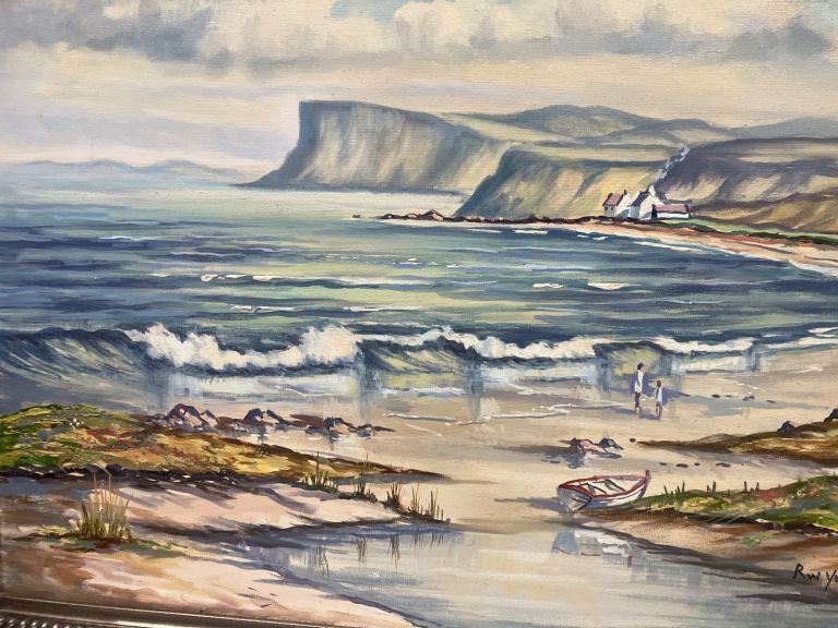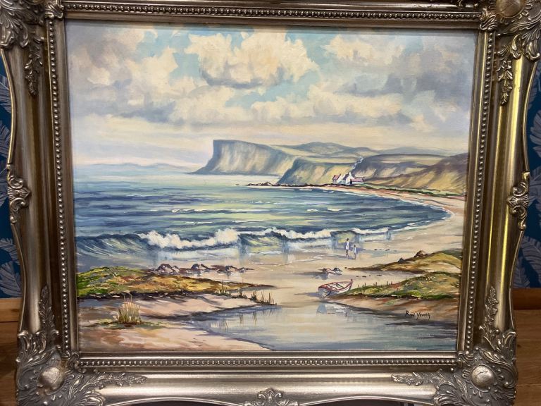 Painting shows view from Ballycastle beach across the bay to Fairhead