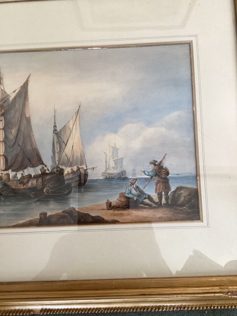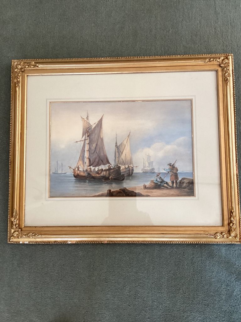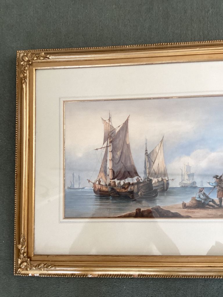 Danish fishing boats off shore measures 27.5”/23” 19th century watercolour in superb condition especially for age