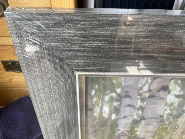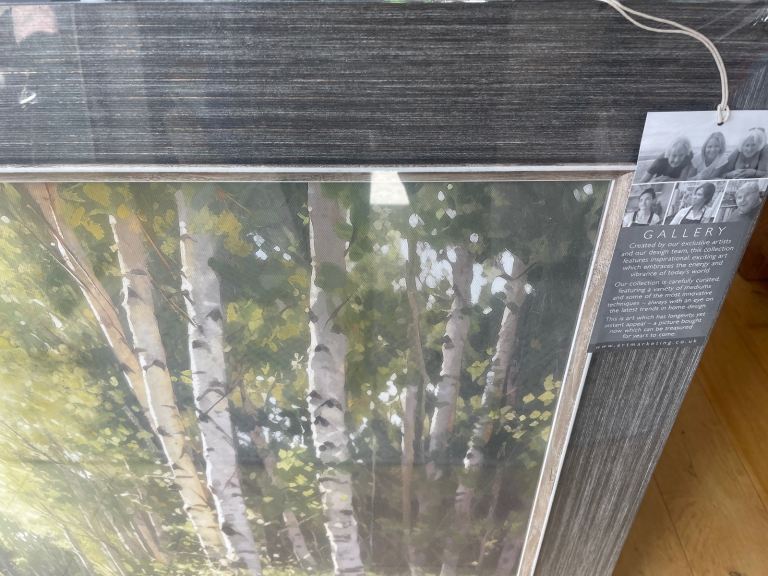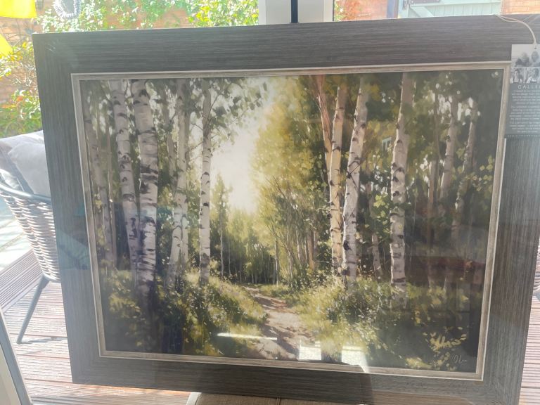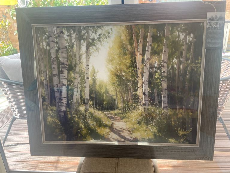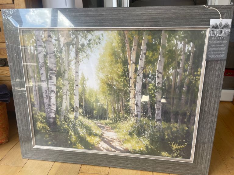 Brand new Forest picture with silver birch trees, with the sun shining through. Lovely large picture, the size 38x30in with grey wooden frame. Still covered in plastic cover