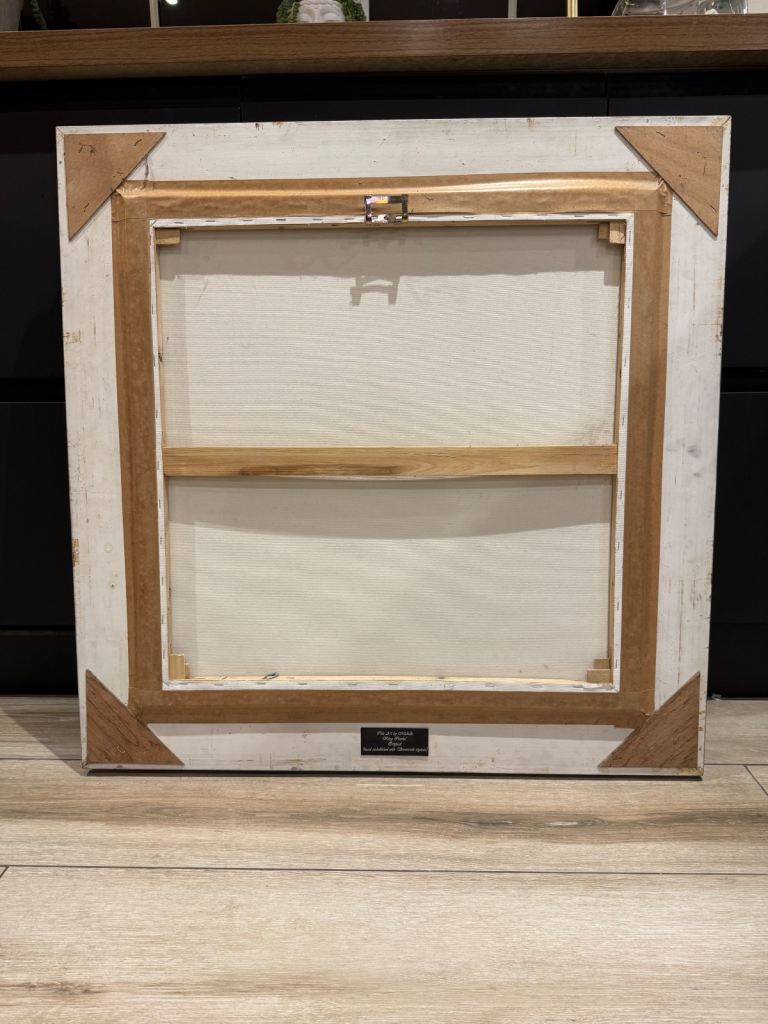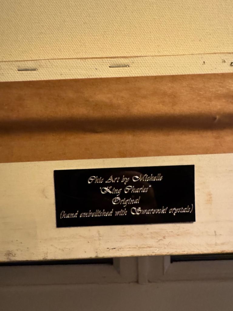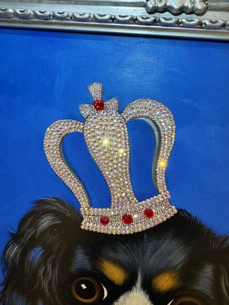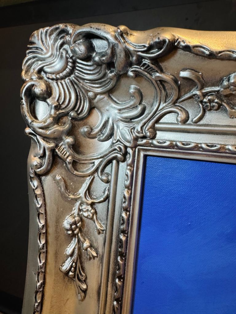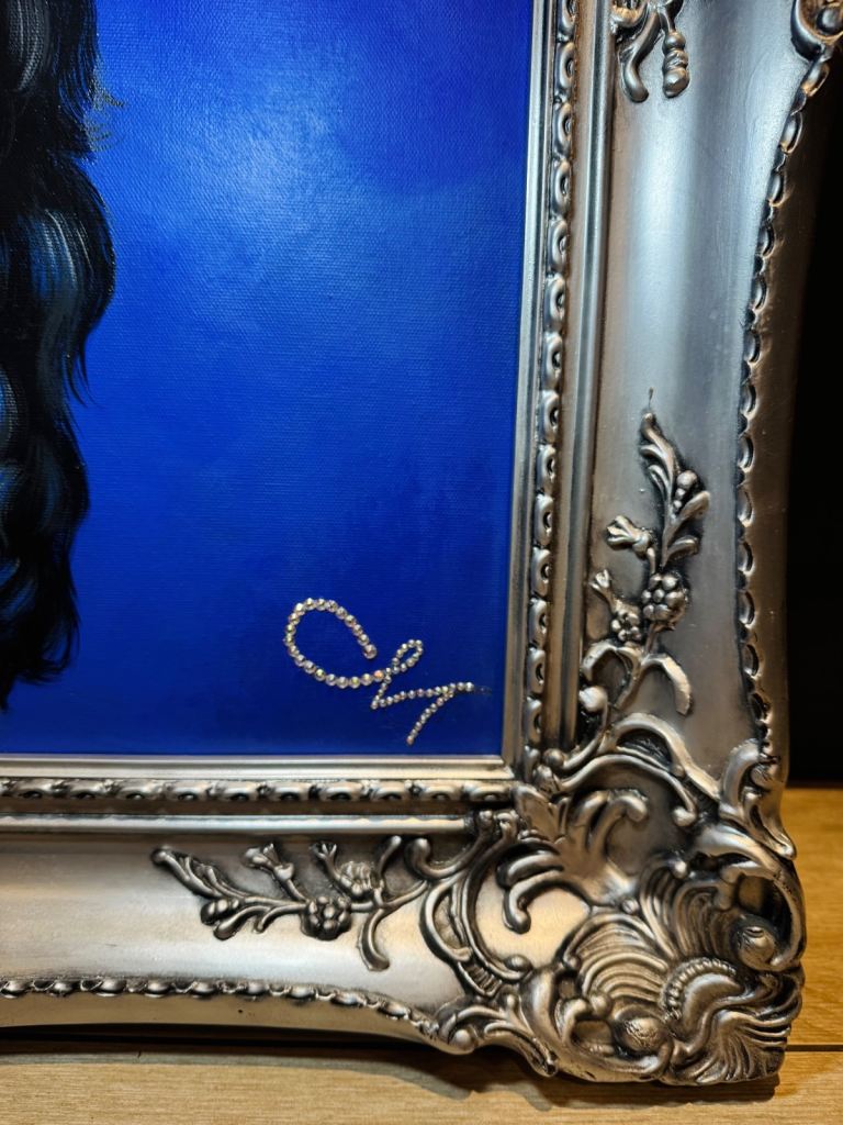 Beautiful baroque silver frame with hand painted canvas on mount. Hand embellished Swarovski crystals.