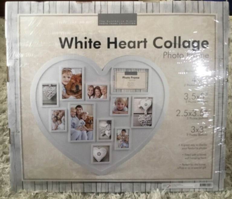 Here I have a lovely new heart-shaped photo picture-frame, in a subtle cream, with 11 apertures in different sizes, as per pics. It has a wall hanging hook and is brand-new. Unfortunately, due to storage, I ripped the front transparent wrapping slightly, so have used a bit of cling-film to protect it instead. Comes from a pet/smoke-free home, and is priced to sell. Collection is from West Wirral (CH48) and, any questions, please do not hesitate to ask. Thank you.