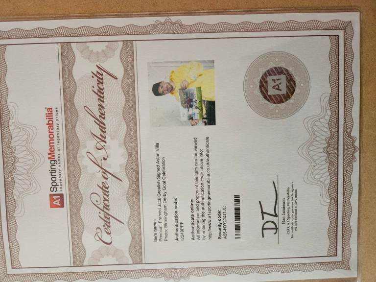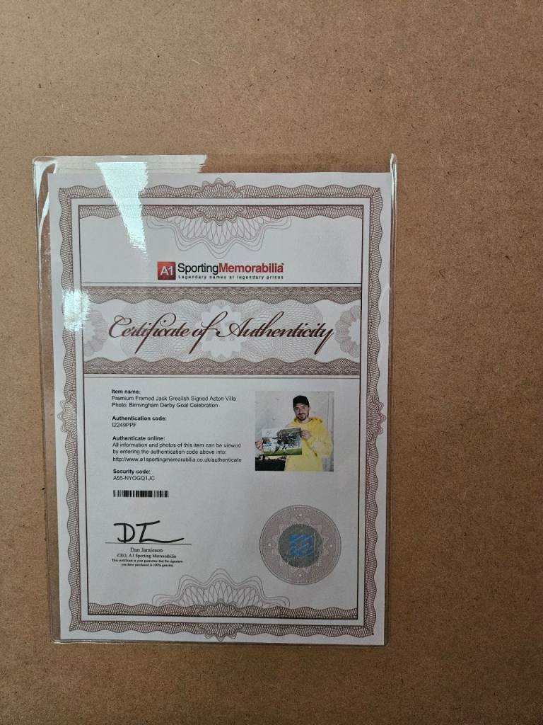 Jack Grealish signed Aston Villa photo. Personally hand signed by Jack Grealish at a private signing session in Manchester on 20/09/2023. Each item comes complete with its own official certificate of authenticity, which serves as proof that your item is genuine. Presented in standard photo framing. As good as new.