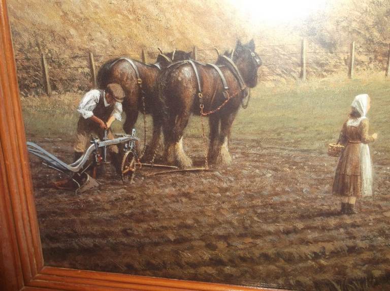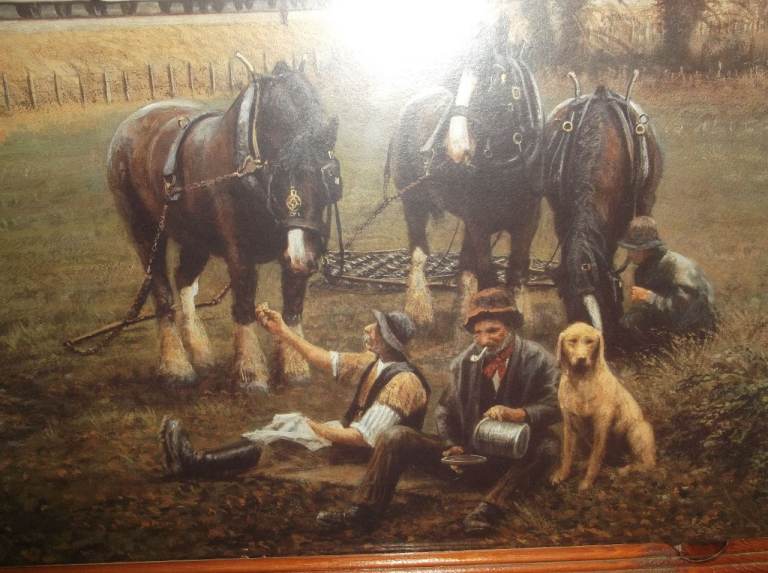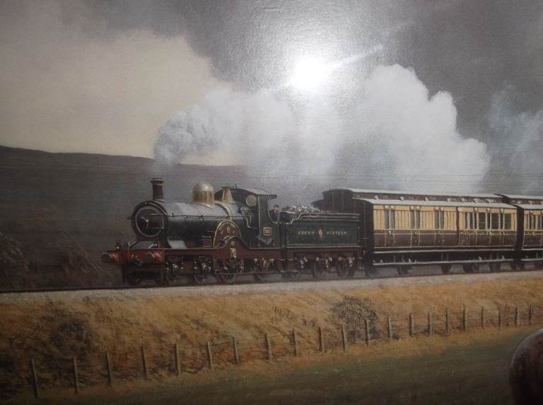 Large Framed Picture Print of GWR Steam Train and Working Heavy Horses by Gerald Broom. Lovely countryside scene of heavy horses and farm workers as GWR steam train goes past near Brent. Original painting was 1913. In pine frame behind glass. 34 inches long x 24 inches high. Very good condition. £15.