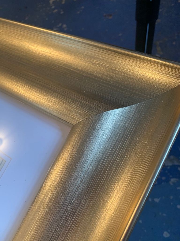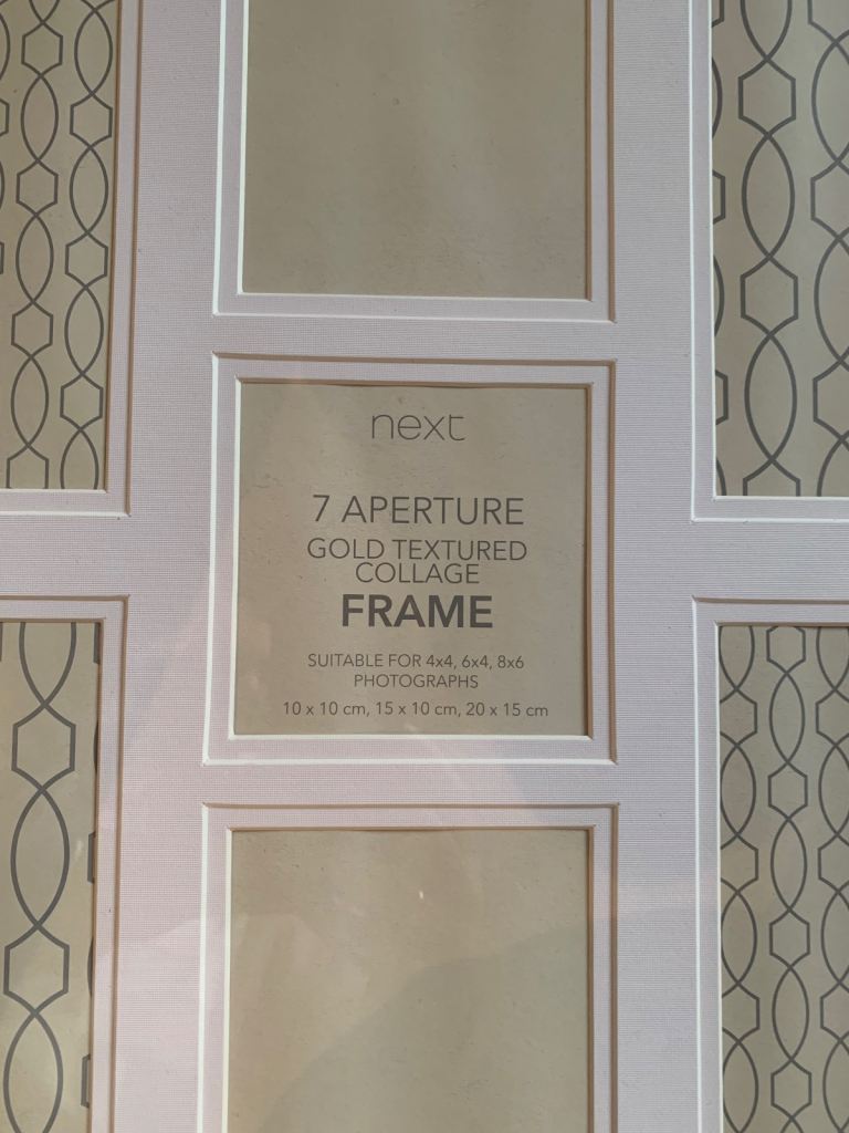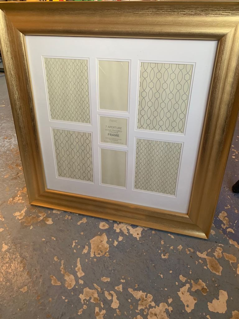 Brushed gold multi-aperture photo frame from Next 69.5cm square. Never been used. See pictures for sizes of spaces for individual photos.