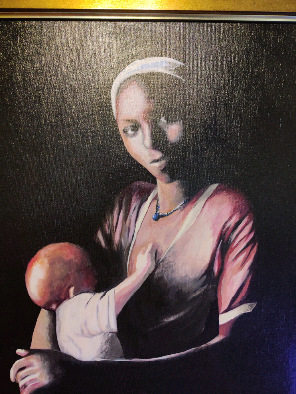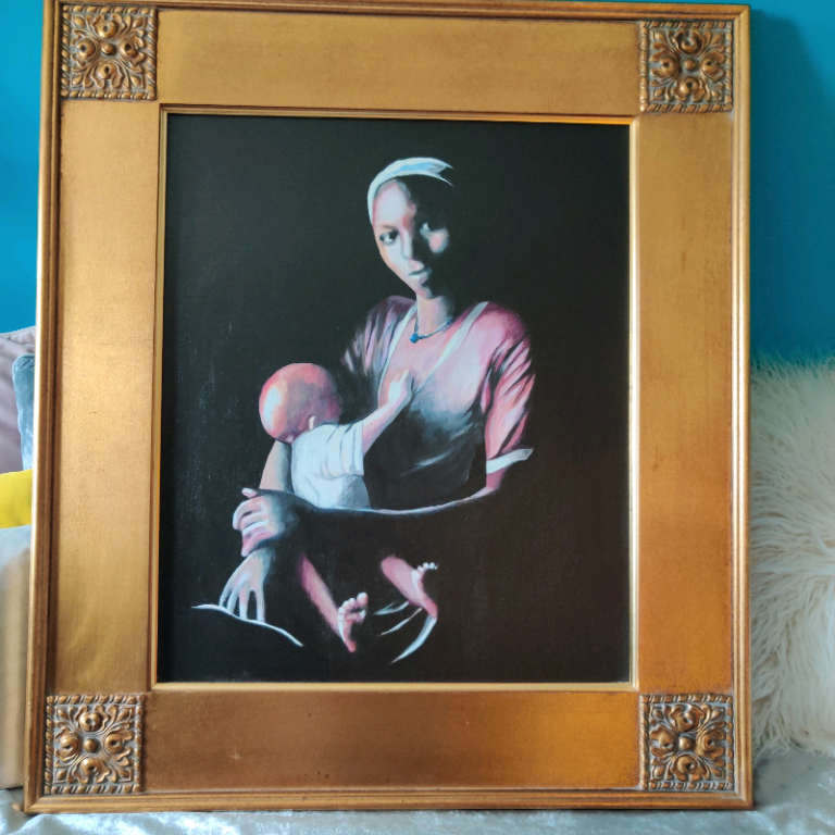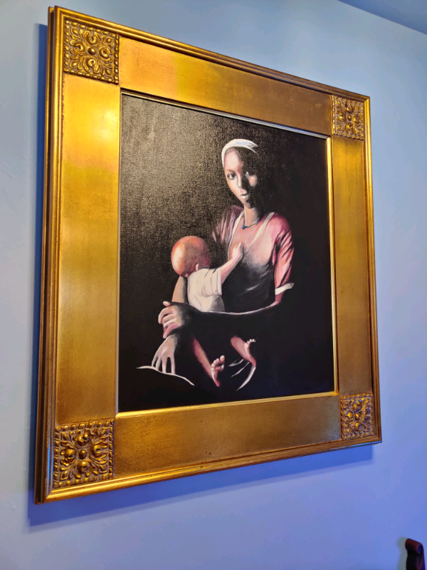 A Large Hand Finished Oil Painting of Maternal Subject, in A High Quality Gilt Frame in Excellent Condition. Mid to Late Century.H 84 x 74cm x 4cm.