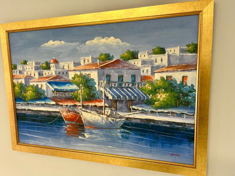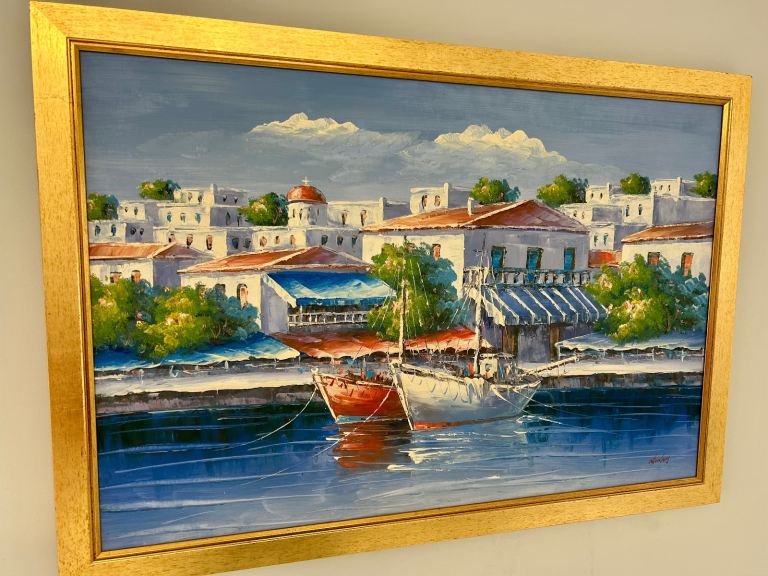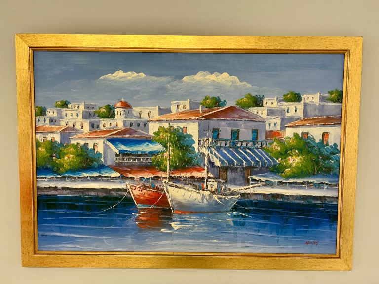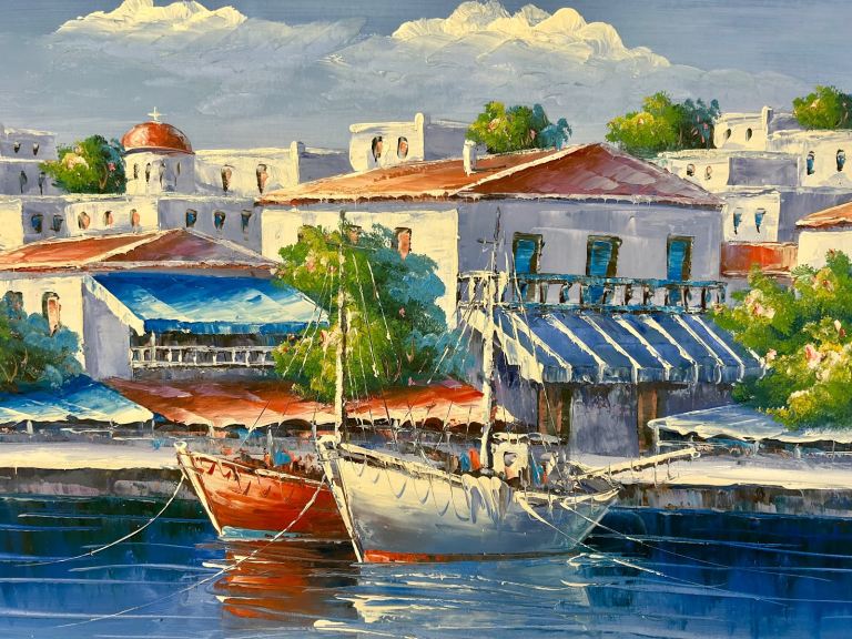 Mediterranean Harbour Scene – Signed Oil Painting (Nicolady) LARGE SIZE