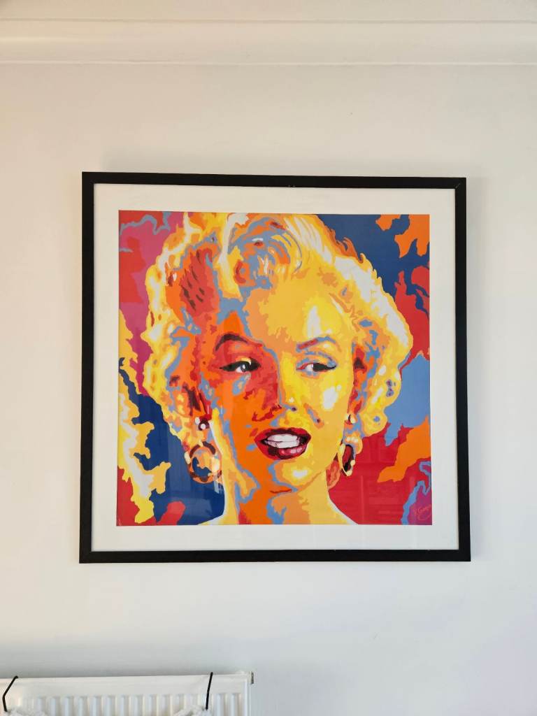 A massive frame of a printed Marilyn Monroe. Measuring 103cm x 103cm so just a little over 3ft. Had it a few years, not bad condition, a couple of marks on the frame but not noticable . It's not glass but Perspex, i think!