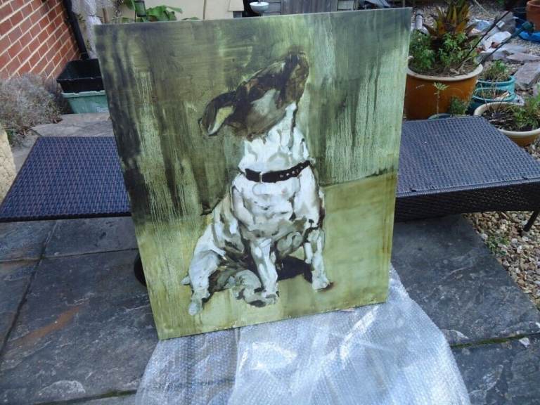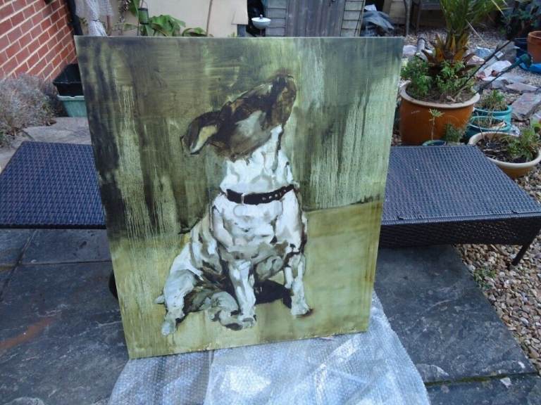 This is a very large canvas of a Jack Russell dog. It is done in a water colour effect.